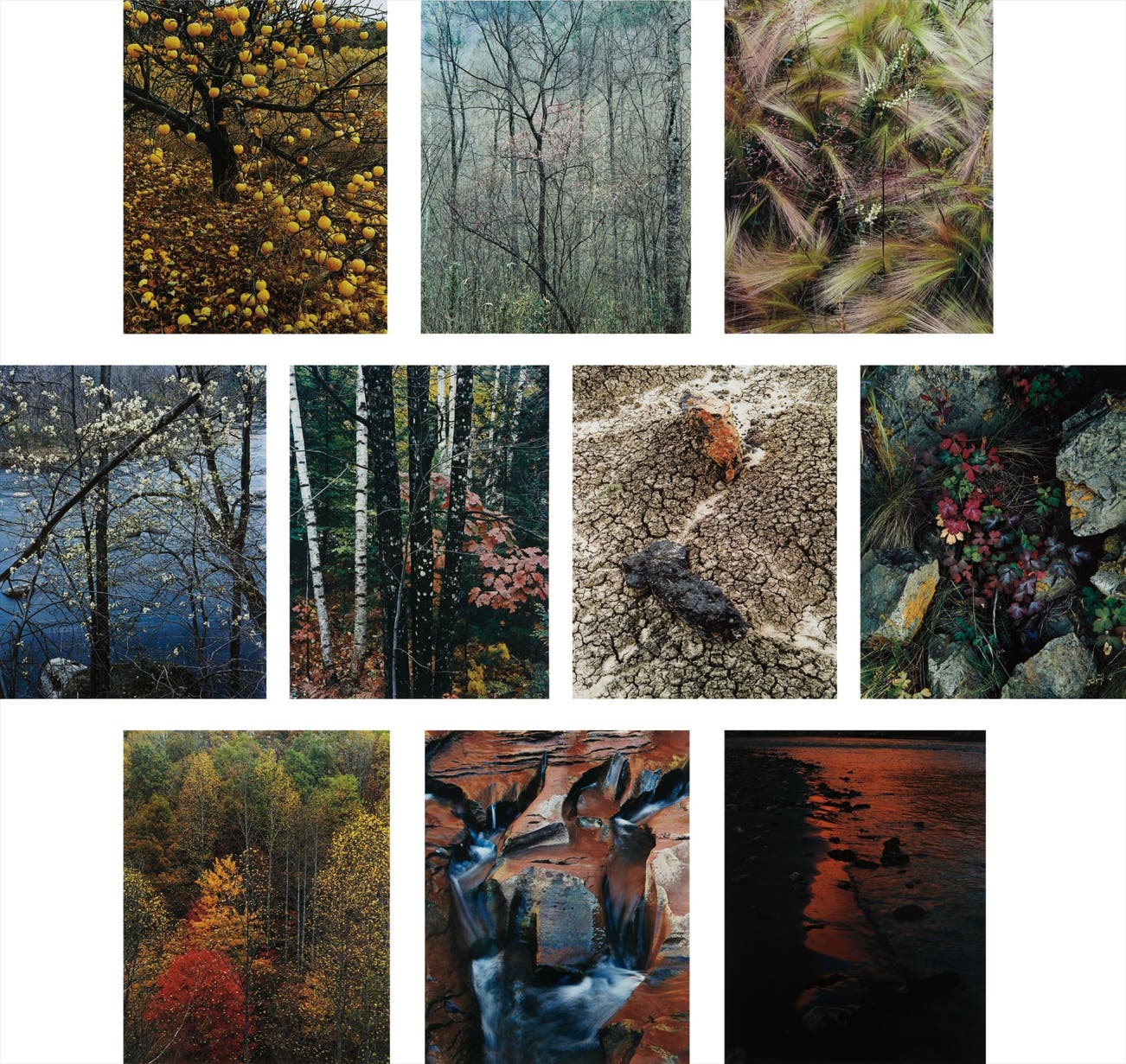 Titles in plate order: Redbud trees in bottomland. Near Red River Gorge, Kentucky. April 17, 1968; Colourful trees. Newfound Gap Road, Great Smokey Mountains, National Park, Tennessee. October, 1967; Foxtail grass. Lake City, Colorado. August, 1957; Shadbush. Near Hillsborough, New Hampshire. April 28, 1957; Columbine leaves, Great Spruce Head Island, Maine. July 27, 1974; Frostbitten apples. Tesuque, New Mexico. November 21, 1966; Trunks of maple and birch with oak leaves. Passaconaway Road, New Hampshire. October 7, 1956; Stones and cracked mud. Black Place, New Mexico. June 9, 1977; Rock-eroded stream bed. Coyote Gulch, Utah. August 14, 1971; River edge at sunset. Below Piute Rapids, San Juan River, Colorado. May 24, 1962