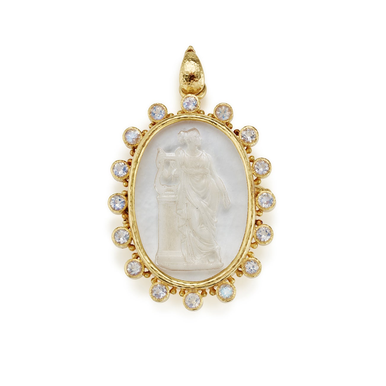 A Mother-of-Pearl Backed Intaglio Glass, Moonstone, and Gold Pendant/Brooch
