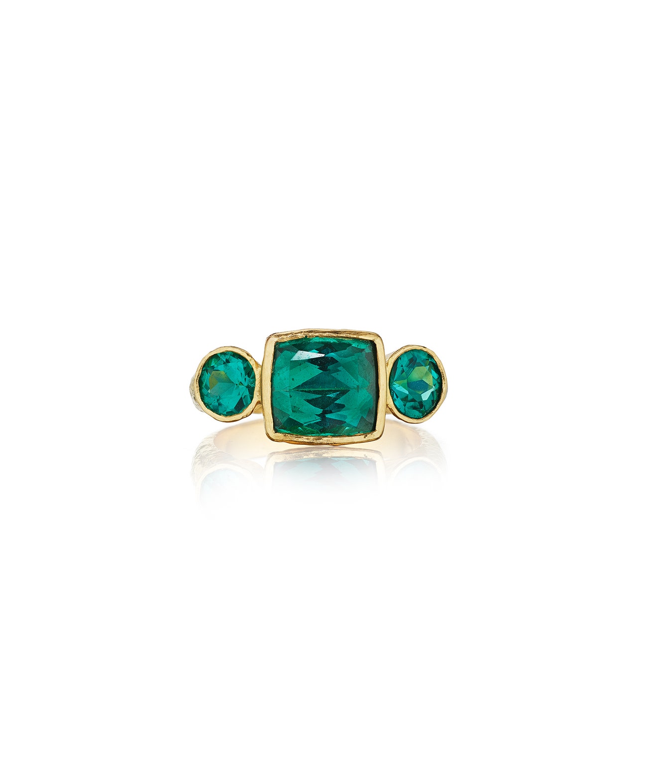 Centering a cushion-shaped green tourmaline, sided by 2 round green tourmalines, mounted in textured 19K yellow gold, size 7, with maker's mark.