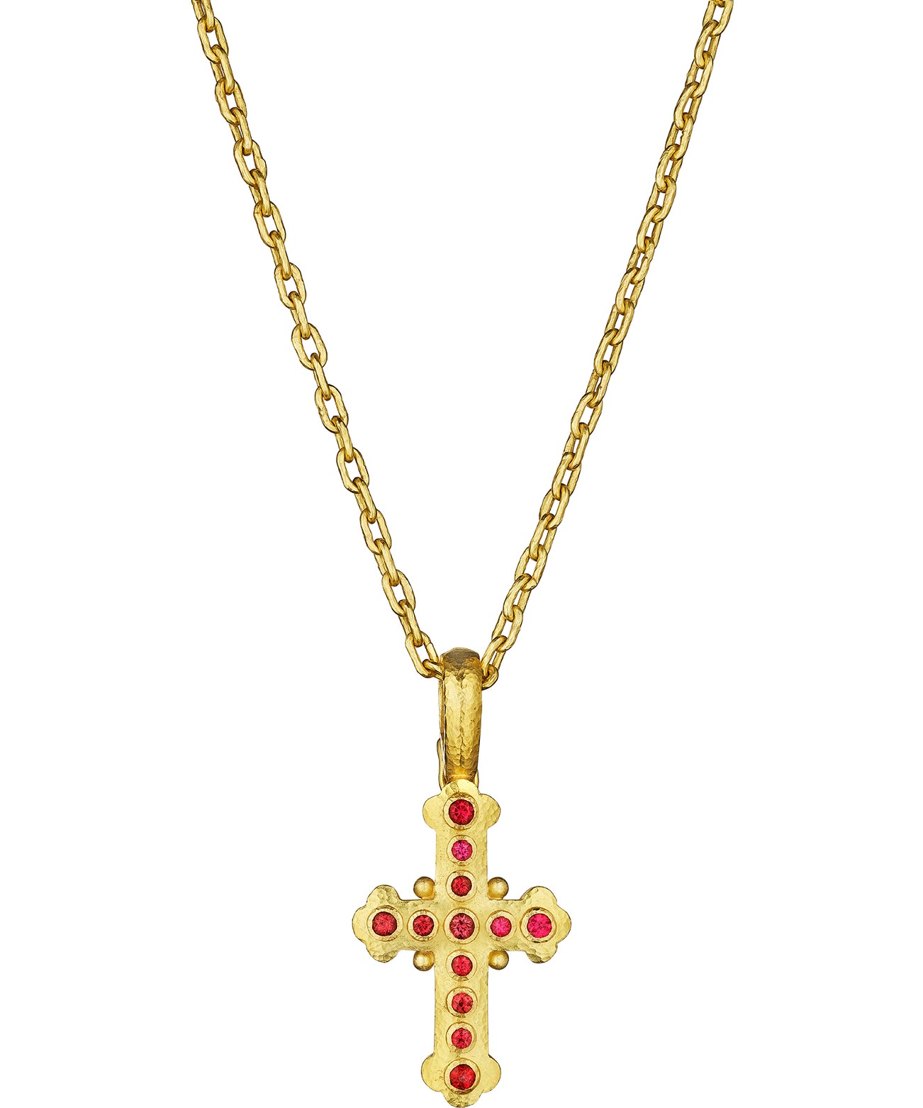 Composed of textured gold, decorated with round rubies, mounted in 19K yellow gold, chain length measuring approximately 17 inches, pendant length approximately 1 5/8 inches, with maker's mark.
