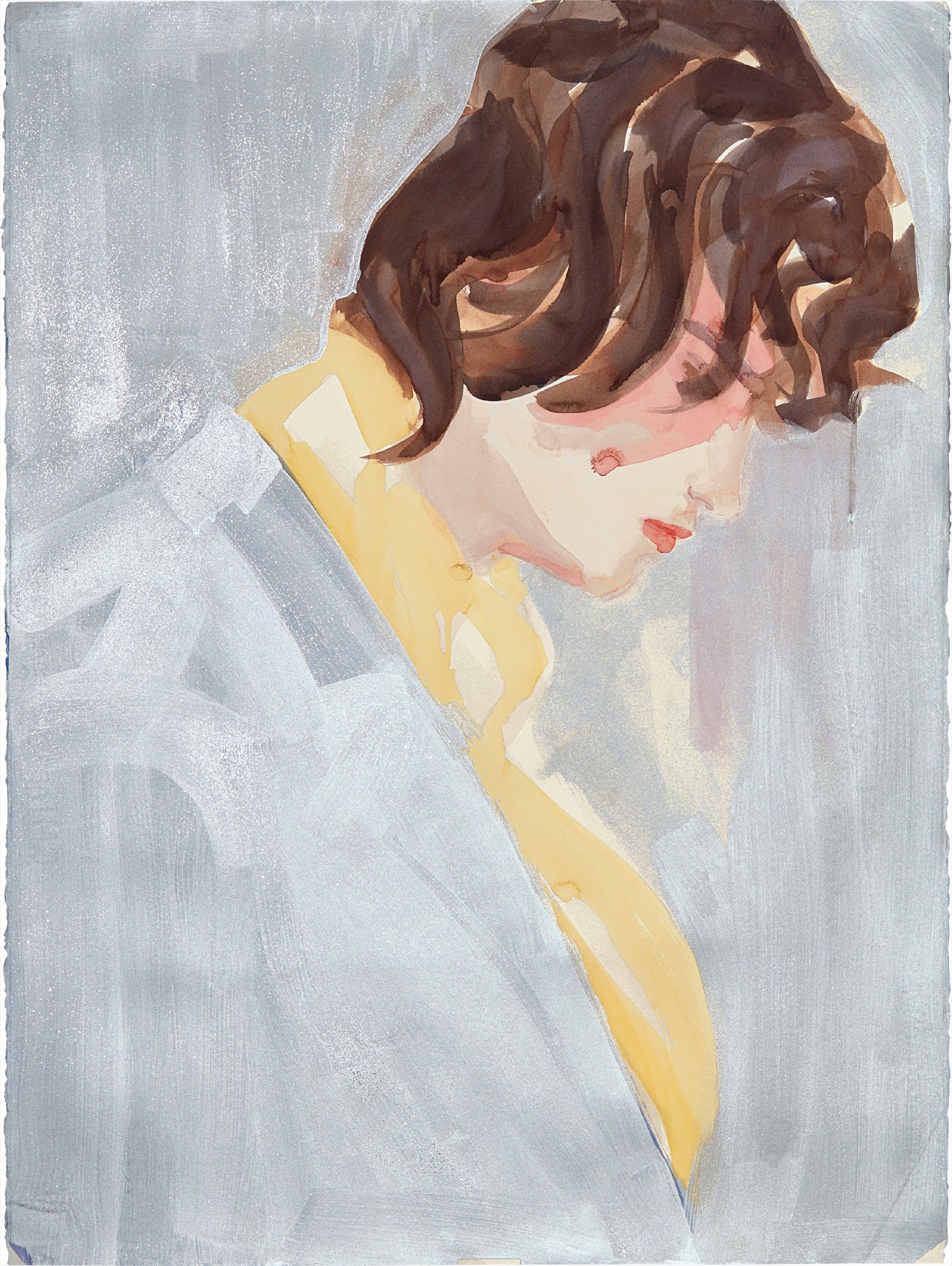 While many of Peyton’s notable portraits are inspired by both famous, contemporary musicians and artists as well as prominent historical figures like Napoleon, some of the artist’s most celebrated works are the ones inspired by her own friends and loved ones. Silver Tony belongs to this personal category, which depicts Peyton’s longtime boyfriend Tony Just. After meeting Just at a party in the late 1990s, Peyton immediately began painting and drawing him, portraying him in a variety of intimate settings. As she recalled in an interview in 2005, “It really felt like I’d waited my entire life to meet Tony. He was magnetic. I wanted to look at him all the time.” (Elizabeth Peyton, quoted in Steve Lafreniere, “A Conversation with the Artist” in Matthew Higgs, et. al., Elizabeth Peyton, New York, 2005, p. 252) Peyton explained that she was drawn to Tony for his looks, which instantly reminded her of Napoleon, one of her favorite portrait subjects. In fact, shortly after they started dating the couple took a trip to France where Peyton had Tony pose in front of Fontainbleau, the last place Napoleon lived before he was exiled, and took photographs of him, which then served as the inspiration behind a series of portraits of Tony, created during the late 1990s and early 2000s. In the present lot, Peyton uses varying densities of watercolor to depict Tony’s Napoleon-inspired locks of hair, hanging in front of his eyes as he looks down in profile. Bathed in a glittery, metallic silver background painted over the entire sheet, Peyton renders Tony in an almost deity-like manner. Unlike some of the other drawings and paintings Peyton did of Tony, this work lacks any sort of indication of place, as if Peyton is depicting instead the special space that Tony occupied in her heart. As such, Silver Tony is a uniquely intimate portrait from an important period of both Peyton’s career and personal life.