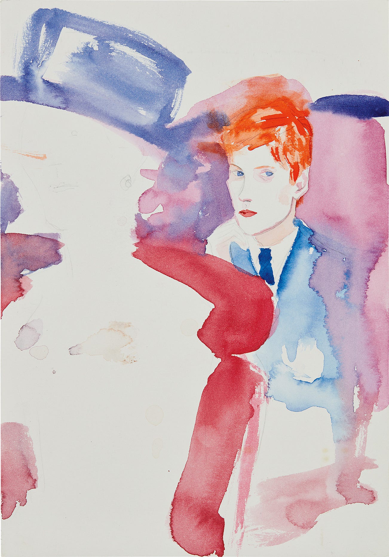 In the present work, Elizabeth Peyton captures the innocent adolescence of the 14-year-old Prince Harry in a flurry of expertly applied brushstrokes, creating an intimate and emotive depiction of the young royal. The portrait was executed a year after the death of Diana, Princess of Wales, an event that shook the world and focused global attention on her two young sons. Peyton’s oeuvre is comprised of portraits of cultural icons, musicians, actors and friends alike; Prince Harry is exemplary of a series of works focusing on the young Prince through the late 1990s. Rendered through a wash of watercolour planes and bleeding pigment, Harry appears through the composition in focus, his expression indicative of both thoughtful maturity and youthful vulnerability. Likely taken from a source image of a public event, his body dissolves among a palette of regal reds, purples and mauves. Speaking of her interest in the Royal Family in a video interview in 2013 Peyton stated ‘with Harry, he just sort of shined like an angel’. Focusing on Harry more than other Royal figures, Peyton was intrigued by his special status as a royal in that he is not a direct heir to the British throne, and therefore enjoys a different kind of ‘free’ position (Kamilla Bruus, ed., ‘Elizabeth Peyton: Faces Contain Their Time’, Louisiana Channel, 2013, online, video). The artist’s admiration for the Prince is evident through the tenderness with which she has conveyed Harry’s piercing blue eyes and delicate features. Celebrated for her adept ability at capturing the essence and complexity of a personality or the context surrounding them in her portraits, Peyton’s body of work was recently celebrated at her exhibition Elizabeth Peyton: Aire and Angels at the National Portrait Gallery, London, which opened in Autumn 2019.
