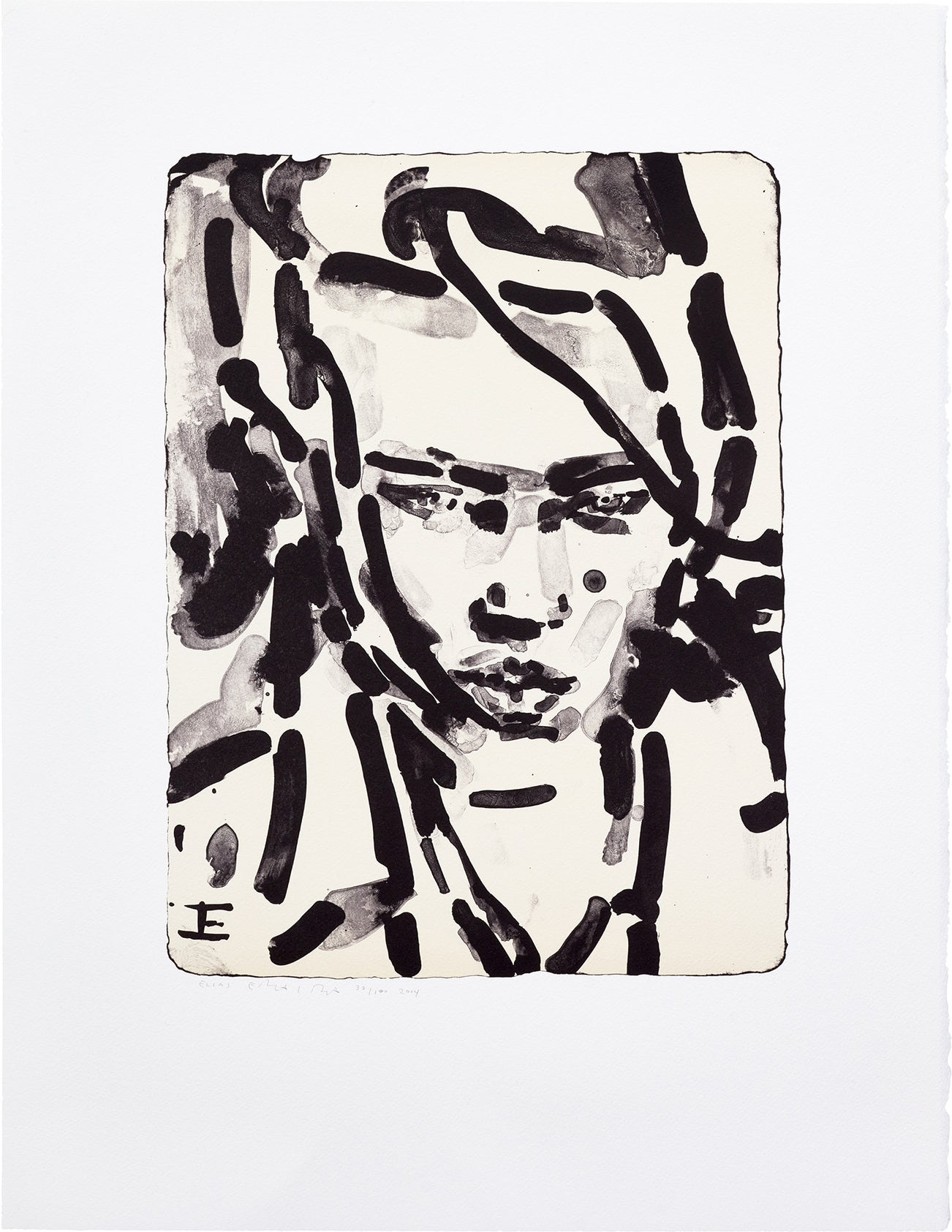 The subject of her edition for “Texte zur Kunst” is Elias Bender Rønnefelt, lead singer of the Danish punk band Iceage. The closeness of the relation between the painter and the musician here translates into the making of the work: Peyton produced the print from life in the studio. It is again the characteristic intervention of form that shapes a moment of mutual artistic appreciation (Peyton first came across Rønnefelt when she heard his voice on the radio), and this moment of the live sitting in the studio, into a picture at once forceful and delicate. - Texte zur Kunst, Berlin