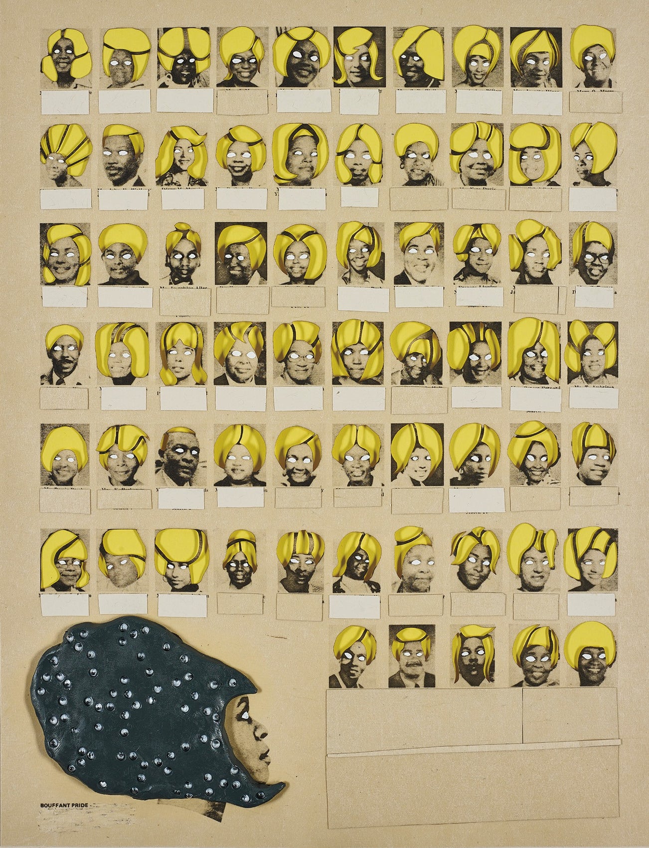 "For this serialized drawing with elaborate hand work, Gallagher has taken advertisements for wigs from the black photo magazine Ebony and preserved them through a series of transformations. Her wig ladies are fugitives, conscripts from another time and place liberated from the musty, yellowed "race" magazines of the past. With photogravure, plasticine, paint, ink, toy eyeballs, scissors, these icons are transformed from and back into the paper that has held them captive for decades."