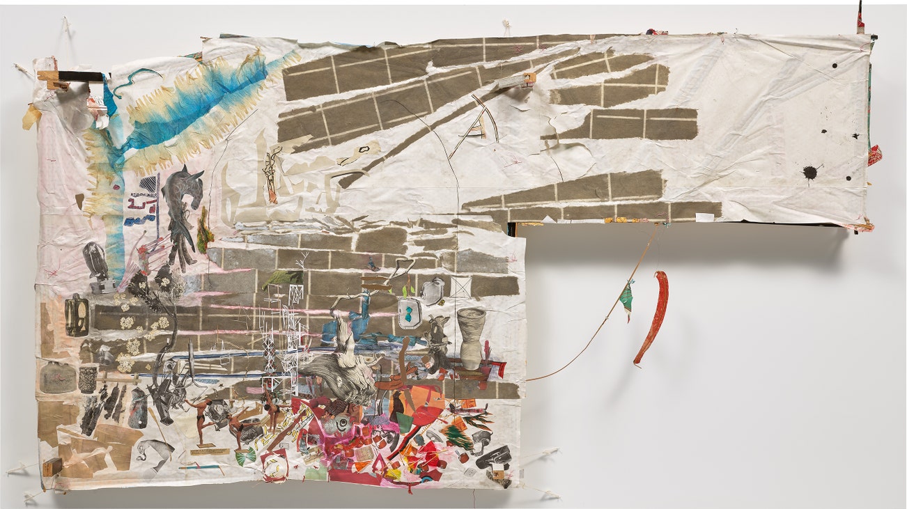 wood, paper, paper collage, string, wire, screws and found objects mounted to board