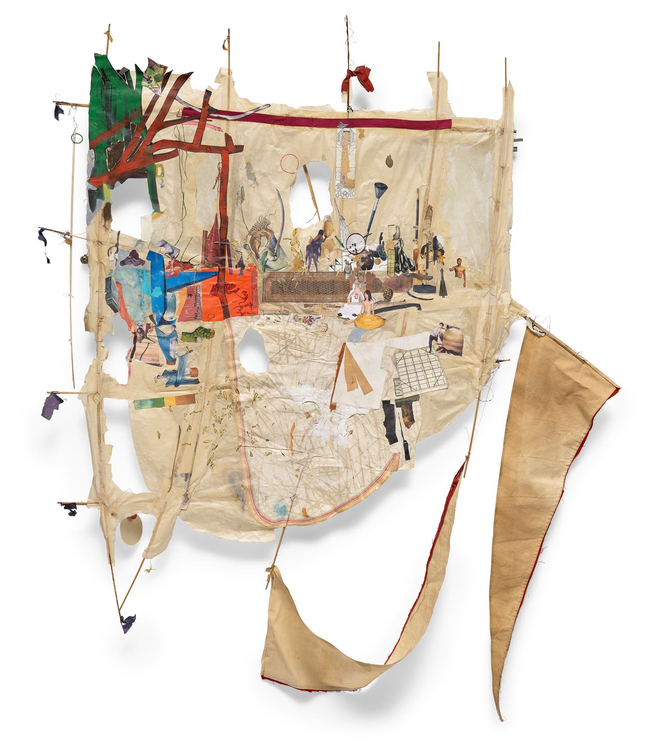 paper collage, fabric, wire, wood and found materials