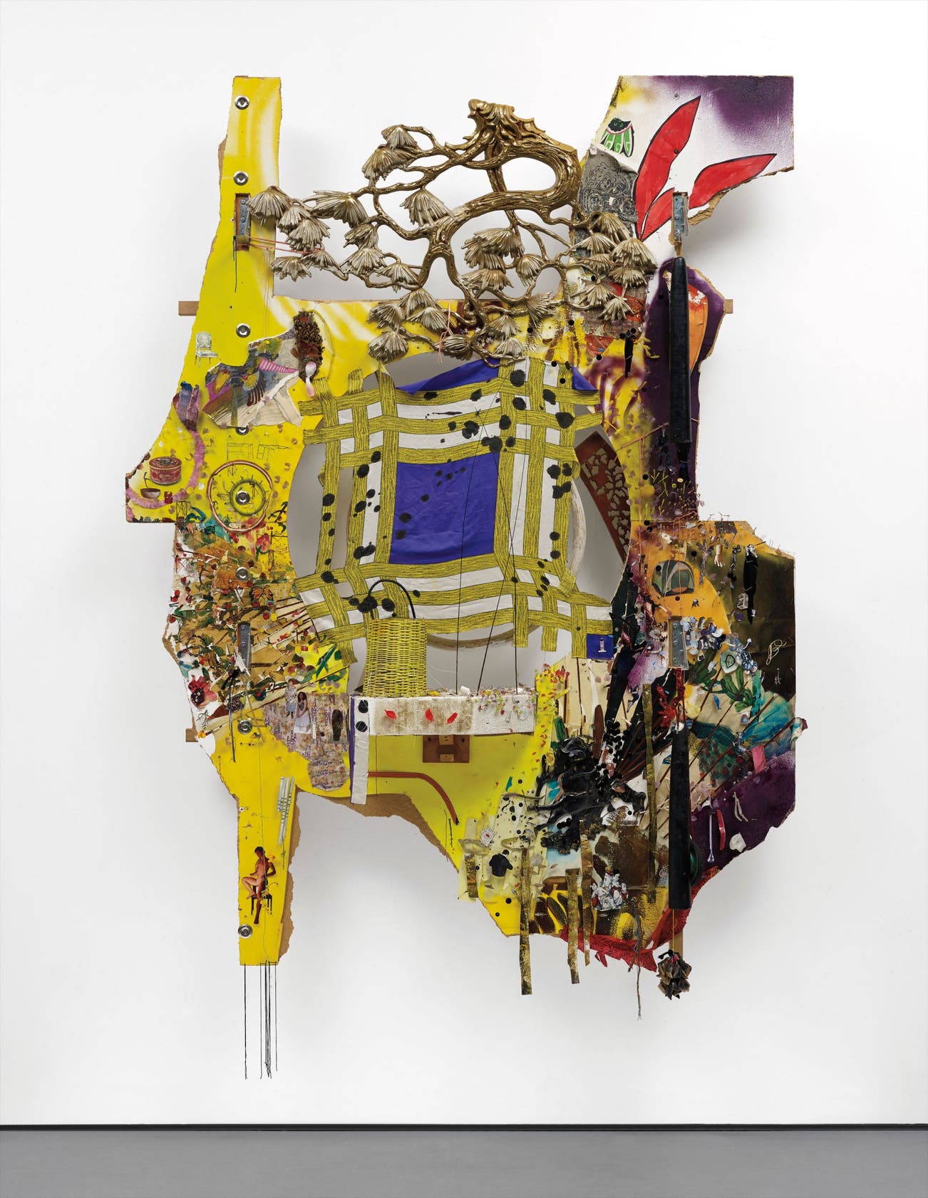 wood, sound board, Styrofoam, plastic, wax, paper, string, glitter, wire, silk, acrylic paint, canvas, tin, pins, feathers, animal claws, metal brackets, wheel