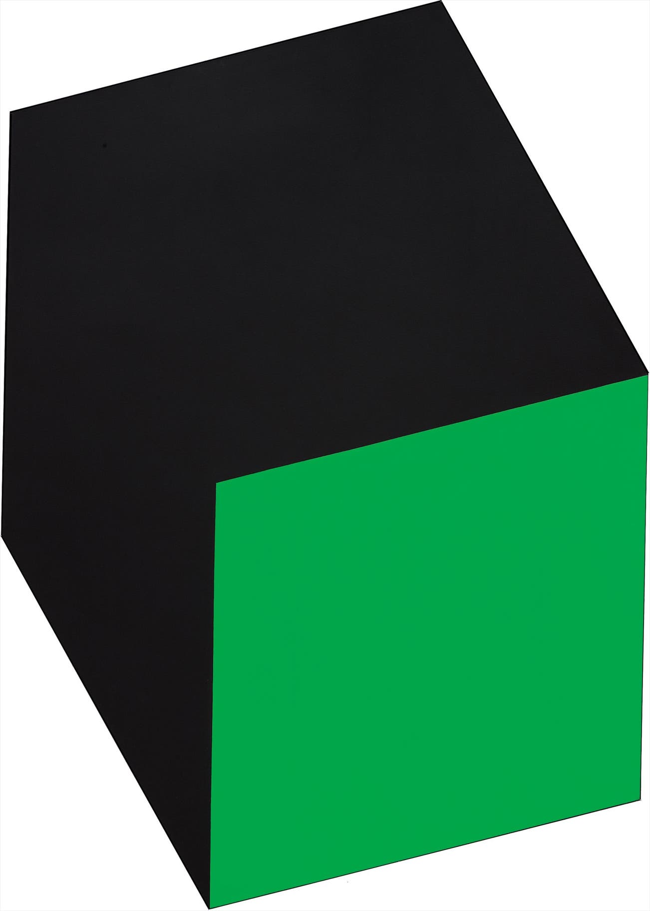 The precise division between the pitch black and bright green of Green Black, 1968, displays stark contrast, yet also coexistence. The border shared between both colors lends Kelly’s geometric work a quality of seamless union. Upon closer inspection, the surface allows no hint at its creation; Kelly’s subtle brushstrokes display no overlap of color or traces of his hand, demonstrating his technical prowess. Within the structure of Kelly’s canvas, two painted shapes take on the visual appearance of a two-dimensional cube. The disjointed proportions lead the viewer to question the dimensions of this cube; were it rendered three-dimensionally, would the fgure’s sides be warped to accommodate the curious lengths of its edges? Since Green Black, 1968 exists only in two-dimensional space, this contemplation is lef unresolved.