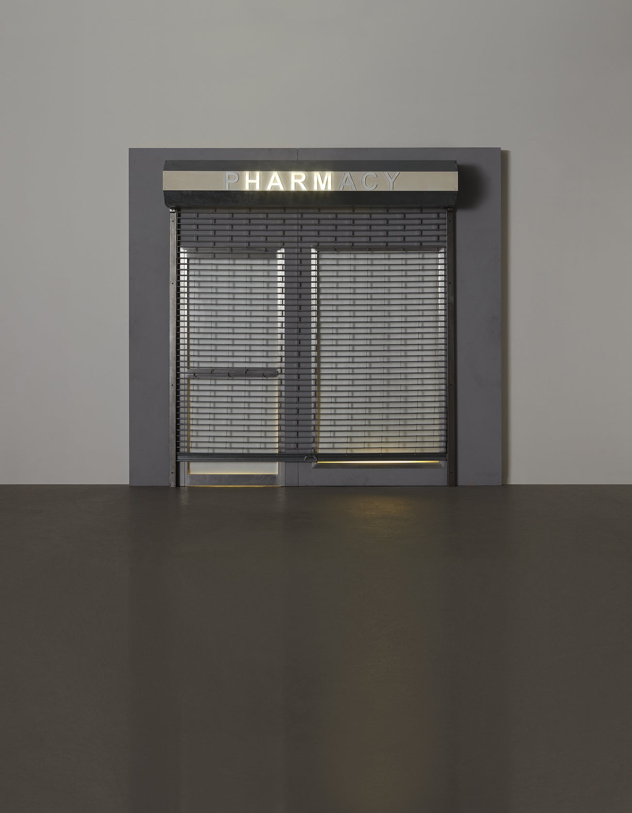 aluminium, steel, Plexiglas, plywood, fabric and fluorescent lights