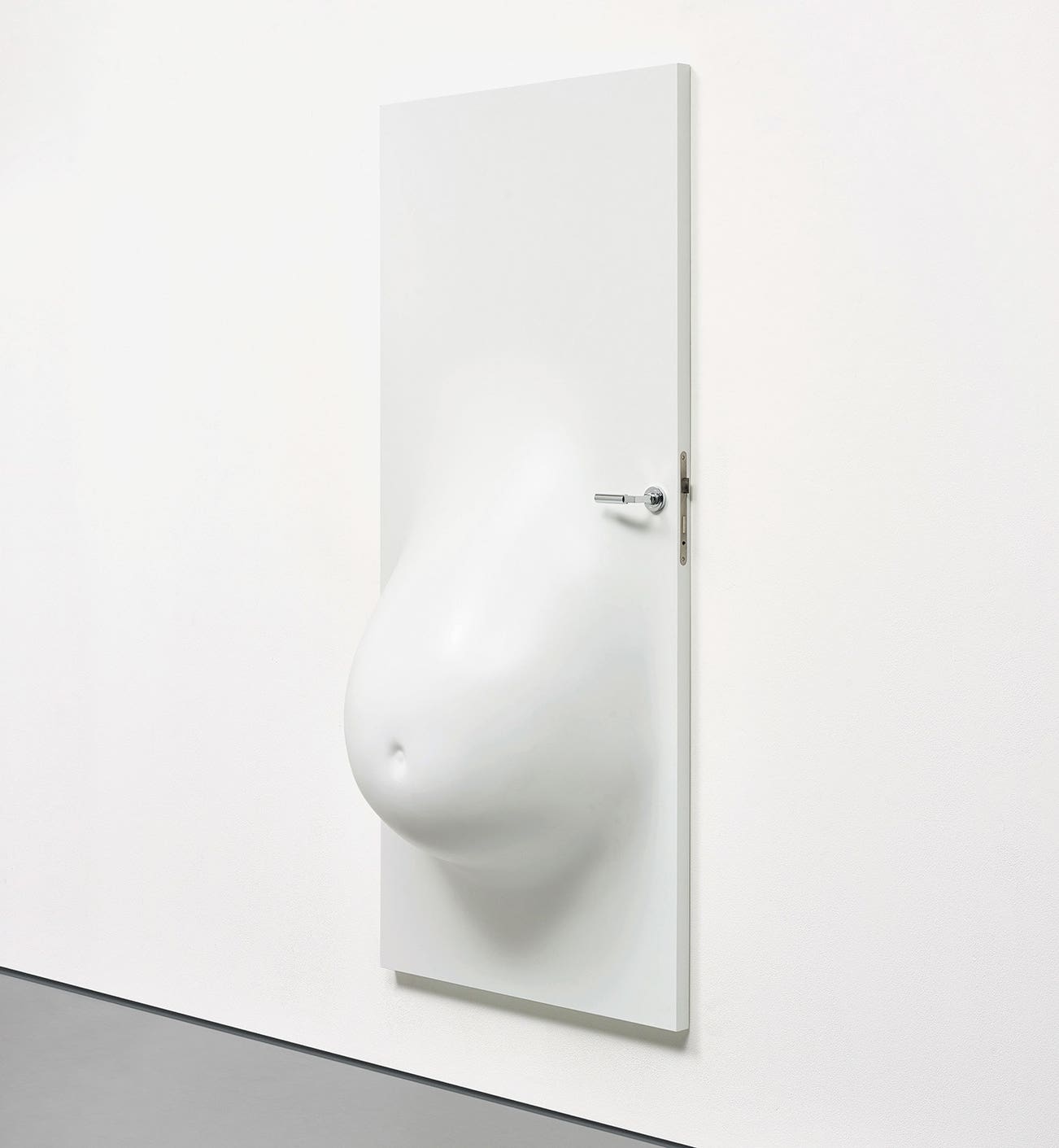 Fibreglass resin covered polyurethane foam on wooden door panel, painted in white acrylic, with silver chrome metal door handle and lock.