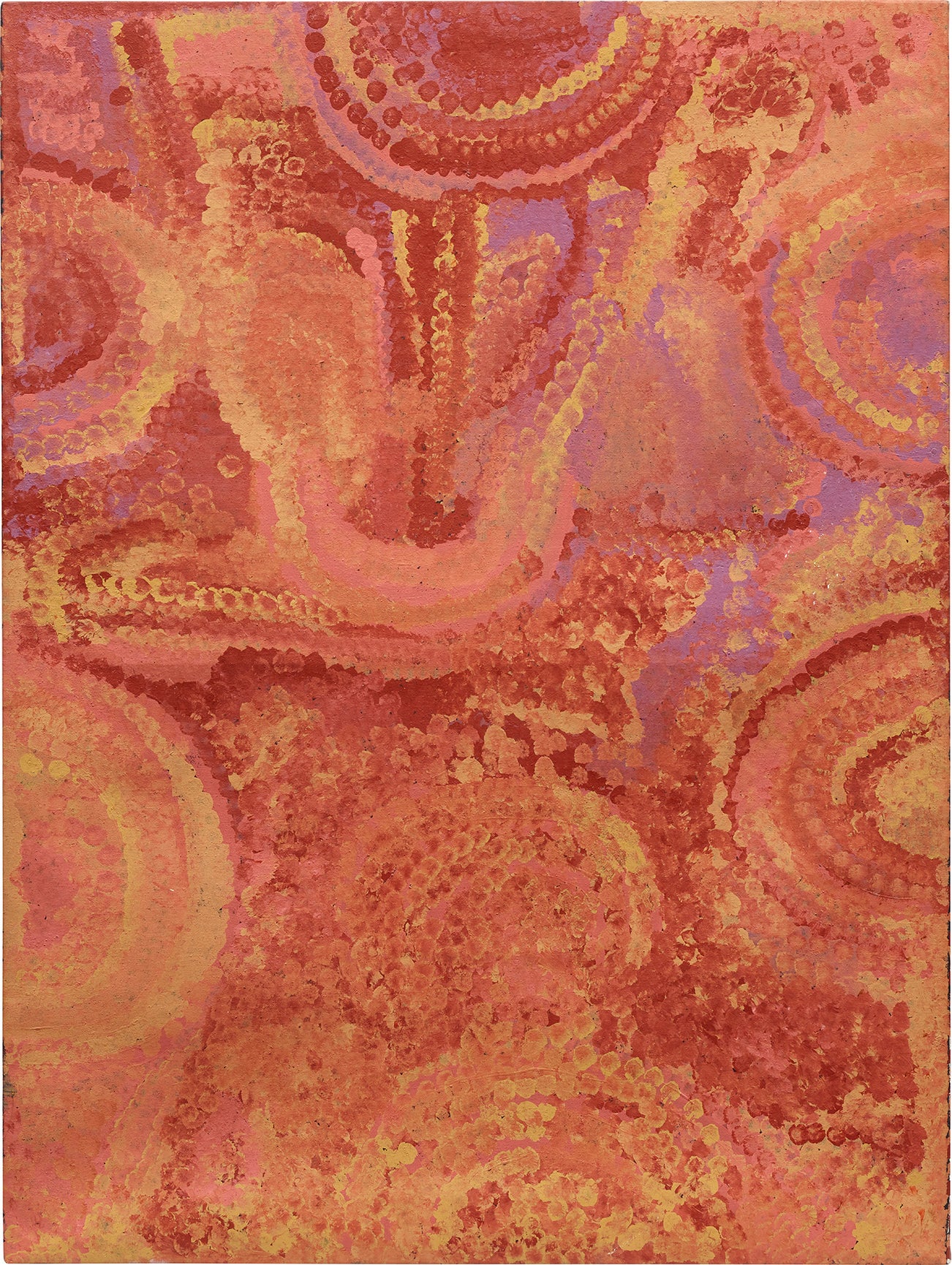 Emily Kame Kngwarreye is celebrated as one of the most important Aboriginal artists of the 20th century. Kngwarreye was born to the Utopia tribe, a community from Australia’s northern territory and her work has been critical in globalizing an often-underrepresented canon of art. Kngwarreye’s practice began within a ceremonial context, designing patterns for body painting rituals devoted to the women of her clan. Untitled is an exquisite example of Kame Kngwarreye vibrant and colourful artistic practice, which translates nature’s lyrical qualities into a unique pictorial language. The work is atypical through its circular patterning and is reflective of the body painting in the traditional Yam ceremonies of the artist’s community. The melodious attributes are drawn from landscapes and sounds of the Simpson desert where she lived. These are interpreted and converted into patterns, lines and forms. In Untitled, Kame Kngwarreye uses an accumulation of painted dots to make abstract forms which mimic the echo heard from the wind blowing, sand whirling and plants crackling - thousands of gracefully compiled coloured dots range from reddish- oranges to pink nuances, dabbed with purple hues. Her innate mastery of colour is evident in the way she juxtaposes the vivid pigments which appear to almost be dancing across the canvas. Kame Kngwarreye uses these to create movements which honour the rhythms and tonalities of the natural world that inspire her; these vivacious movements of patterns may also be alluding to the tribal dances performed by the women of her community. In doing so, she integrates her aboriginal roots within her work, highlighting its importance in inspiring her artistic production and inherently allowing the viewer to penetrate her mysterious environment where nature’s harsh and unpredictable characteristics dominate.