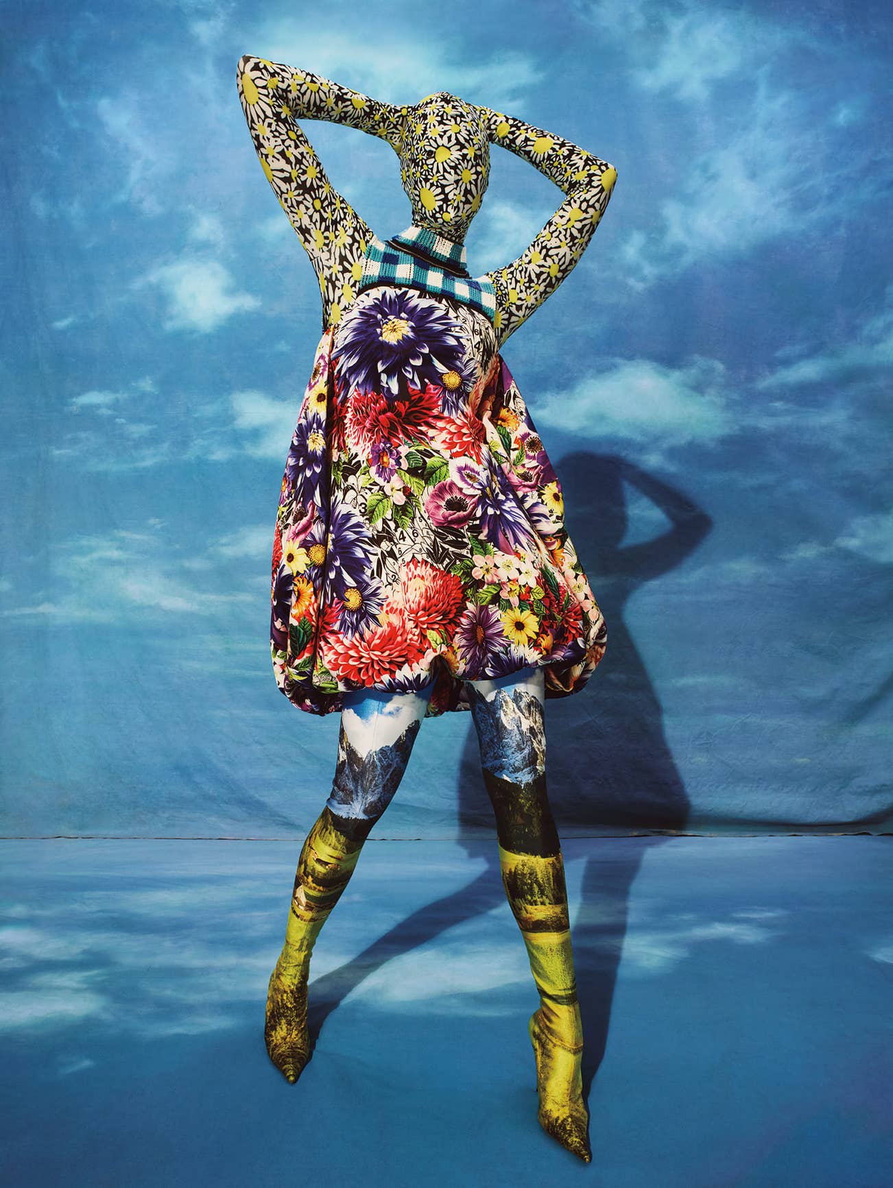 Emma Summerton unveils her whimsical vision with a carefully crafted floral celebration for Vogue Spain’s June 2018 cover story, featuring Karlie Kloss. In the present work, Karlie is presented as a faceless mannequin, covered head to toe in a patchwork of brightly coloured, elaborately patterned textiles. Fabric printed with a sky motif is used as the backdrop, as well as on the floor, transforming the studio into a surreal setting. The fascinating interplay between art and artifice, as seen here, is a distinctive element in Summerton’s photographs. Collaborating regularly with such leading publications as Vogue, i-D, Self Service and Dazed & Confused, Australian-born Summerton divides her time between London and New York. Her work has been exhibited internationally, including ArtisTree’s Beyond Fashion in Hong Kong (2019) and the upcoming Body Beautiful: Diversity on the Catwalk at the National Museum of Scotland opening in May 2019.