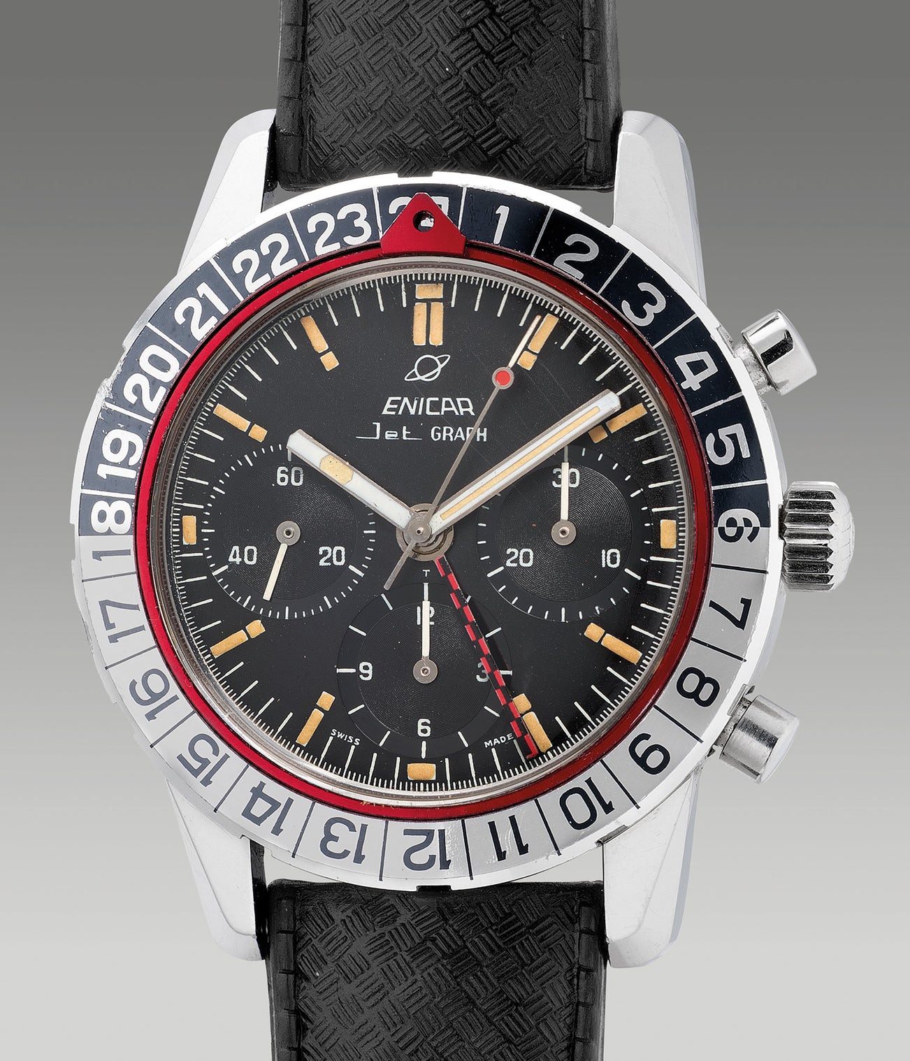 The Jet Graph was purpose built for pilots and travellers. One of the prominent features one would notice is the black and silvered aluminium GMT free-rotating bezel with a 24-hour division. Encased in the Super Compressor Bayonet case made by manufacturer Ervin Piquerez S.A. (EPSA) exclusively for Enicar with brevet patent number 314962, the present example is part of the Mark III generation of the Jet family with the Valjoux 724 GMT chronograph movement. Notable for its red and black checker-styled GMT hands with neon lumes, red pointer ring, baton hands, red lollipop second hand and a waffle crown with Saturn insignia. Offered in an excellent well-preserved condition, this rare black subdial variant is sure a delight for the collector of fine vintage timepieces.