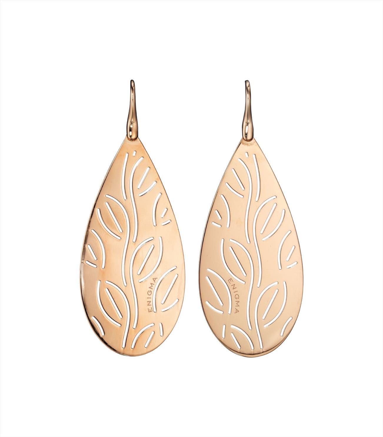 Each designed as a pear-shape plaque, comprising openworkfoliate motifs, mounted in 18K rose gold, length 2 3/4 inches.