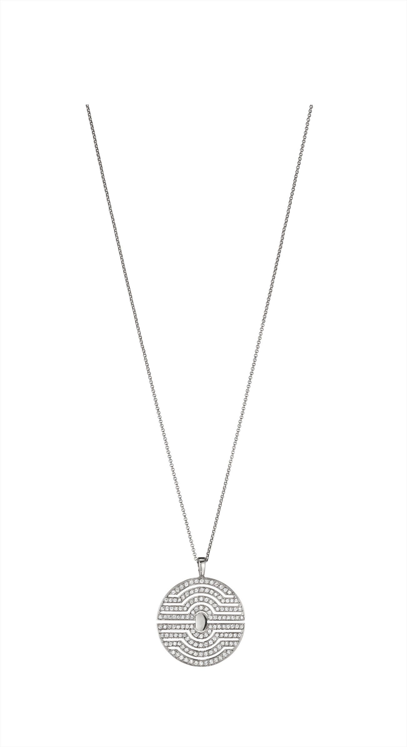 Designed as an open-work articulated disc, enhanced by circular-cut diamonds, suspended from a fine link chain, mounted in 18K white gold, length 18 inches.