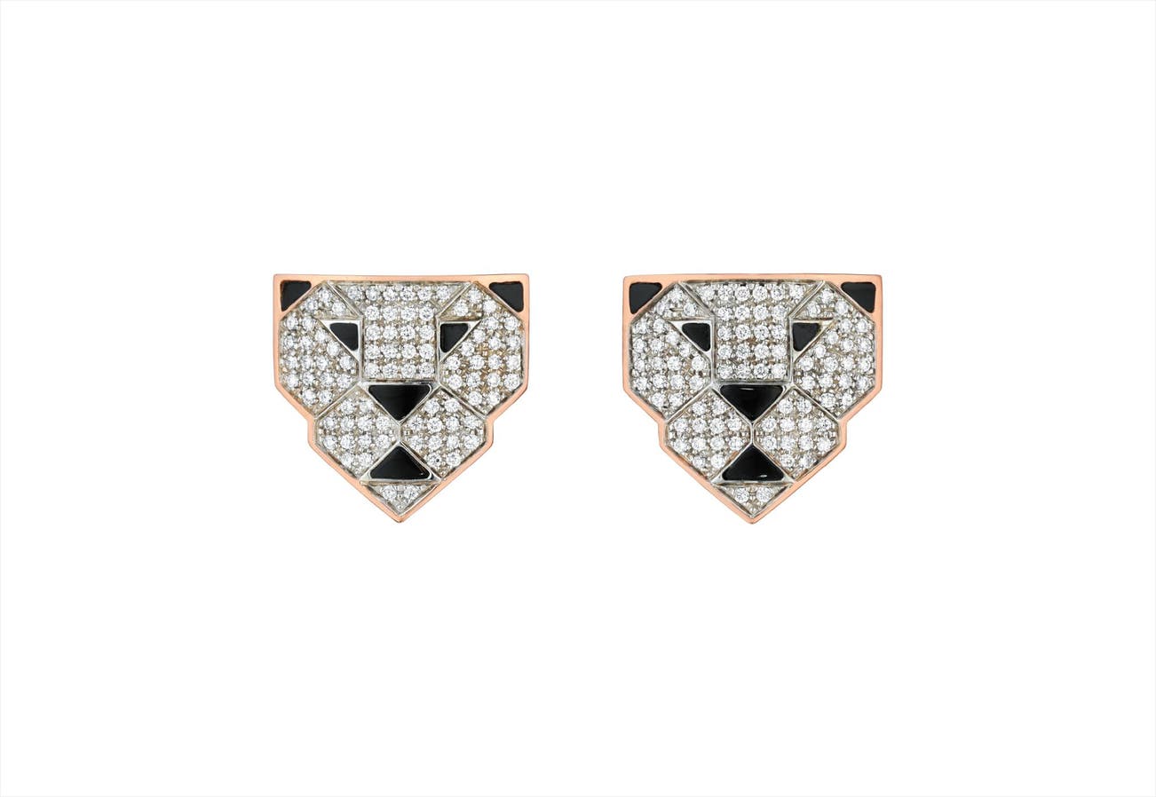 Each designed as a pavé-set diamond lion's head, accented by black enamel, mounted in 18K white and yellow gold, length 3/4 inches.