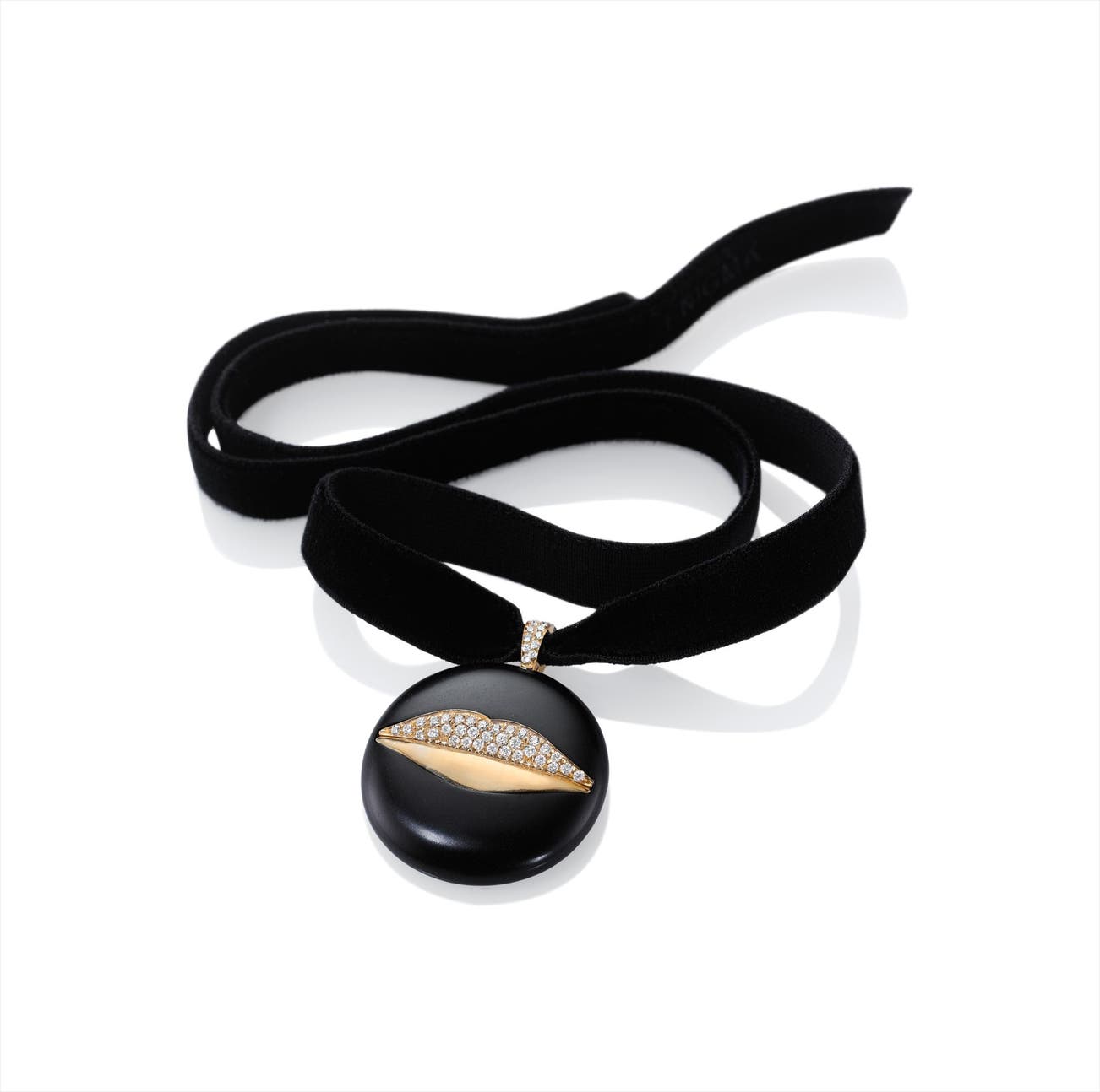 Designed as a carved bombé jet disc, centering upon polished gold lips, the upper lip and bale set entirely with circular-cut diamonds, mounted in 18K yellow gold, 1 inches diameter, with a black velvet ribbon, length adjustable.