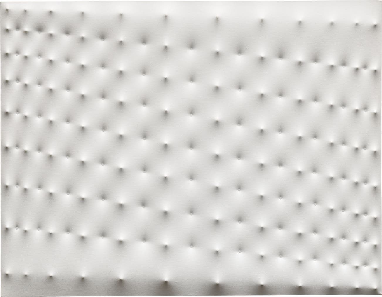 The discombobulating effect of the interplay of light and shadow resulting from the juxtaposition between concavity and convexity in Superficie bianca forces the viewer to confront the physicality of the artwork. The surface of the work both draws the viewer in, as a traditional painting would, whilst simultaneously reaching out to break into the viewer’s space. Castellani rejected the notion of an artwork as merely an illusionistic window and instead presents the work as possessing a physicality of its own, inhabiting a real space within this world. The viewer is transported into the complex yet soft geographies of Superficie bianca and the monochrome surface draws attention to the visual potentialities of an absence of colour, subsequently allowing for the viewer’s entrance into a limitless and timeless realm of sublimity. In this skilfully executed tabula rasa Castellani has freed art from the restrictions of narrative constraints demonstrating the previously latent creative possibilities of surface and form. The spatial and formal artistic investigations that have dominated Castellani’s impressive oeuvre culminate in the chiaroscuro of this energetic and hypnotically monochrome landscape.