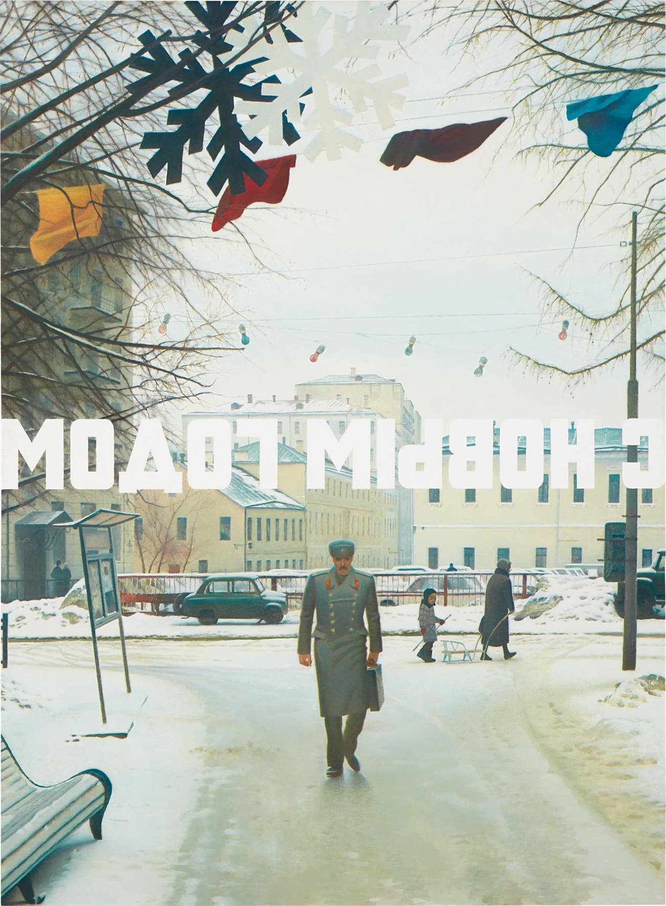 The presence of unlit Christmas decorations and colourful flags do not succeed in attributing a sense of warmth to the composition. Instead, a sense of hostility prevails; the scene is visually associated to the Soviet building blocks dominating its background. By contrasting a well-intentioned ‘Happy New Year’ wish in printed block letters against the gloomy exterior, Bulatov ironically alludes to the uncertain political climate of his native Russia. In the year 1990 the Soviet Union was gradually coming to an end, officially dissolved by December 1991. Bulatov thus denounces the possibility of happiness in the New Year for the depicted Soviet military official, perhaps extending the irony to the viewer living in equally ambiguous times.