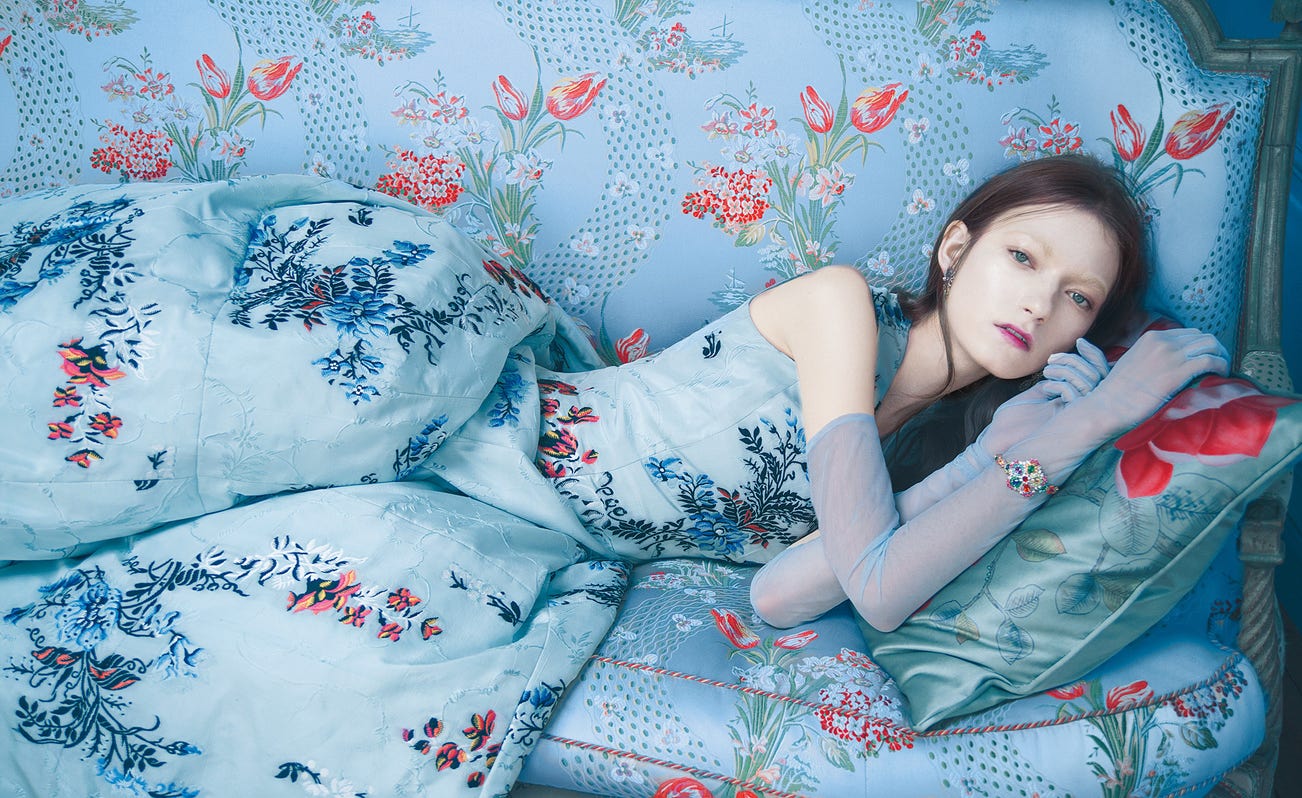 Transporting the viewer to a bygone era, this image by Erik Madigan Heck was created for Town & Country’s December 2014 editorial ‘Dreamcatchers’, featuring hypnotic Polish beauty Kasia Jujeczka. In Heck’s distinctive approach to image-making, photography and painting intersect: ‘Paintings make me think more abstractly about my photographs, ’ explains Heck, ‘They aren’t as limited as photographs are – they are physically built rather than taken, so to speak.’ His painterly aesthetic is seen in his treatment of colour and pattern; the pale blue and the florals in the present work function to flatten the picture plane. Heck is a regular contributor to The New York Times Magazine, Vanity Fair, TIME and The New Yorker and in 2013 became one of the youngest artists to receive ICP’s Infinity Award. His first monograph Old Future was published by Thames & Hudson in 2017 and his work has been shown internationally, including Foam’s 2014 exhibition Don’t Stop Now: Fashion Photography Next and ArtisTree’s Beyond Fashion in Hong Kong (2019).