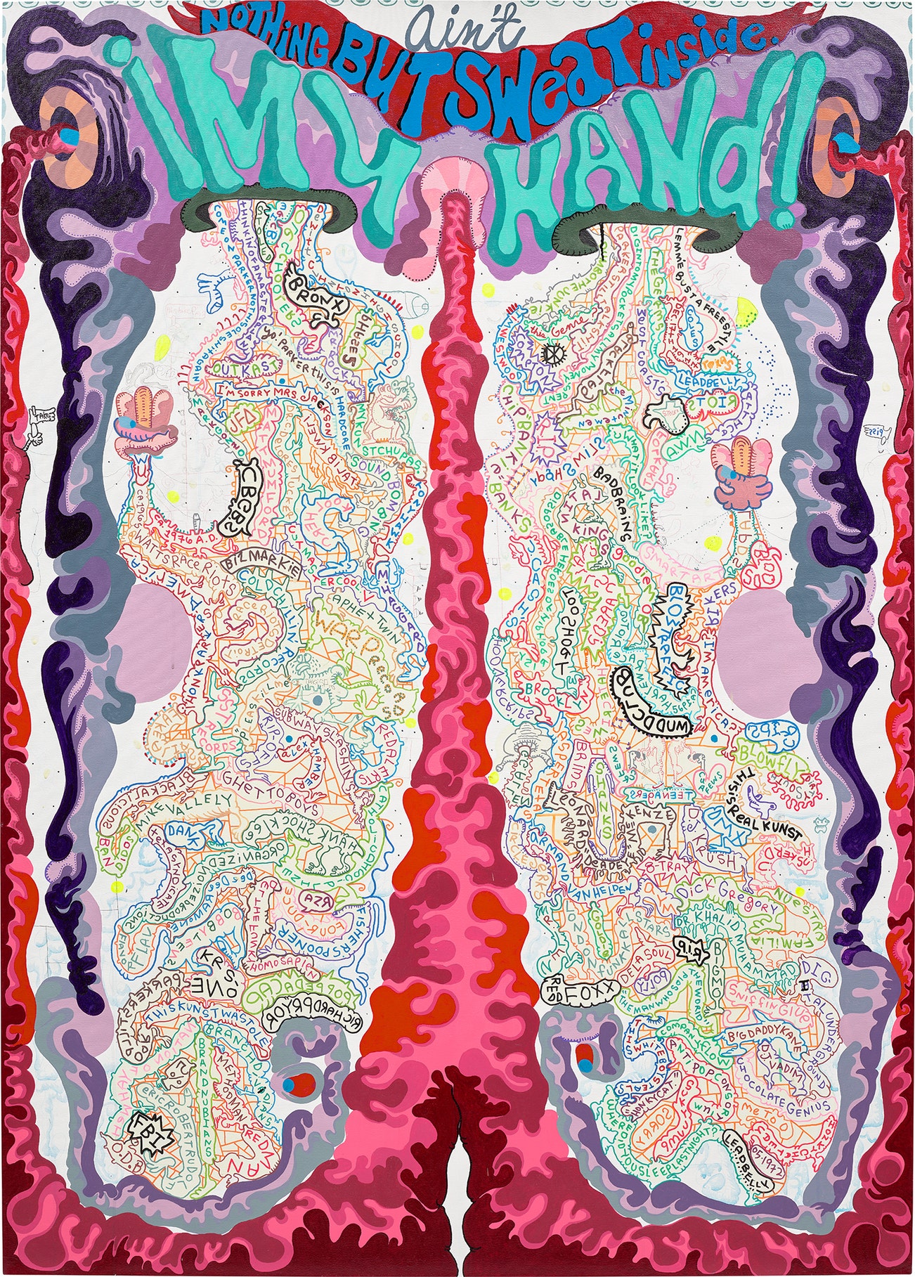 signed, titled and dated '!AIN'T NOTHING BUT SWEAT INSIDE MY HAND! Erik Parker 2000-2001 ERIK PARKER' on the overlap; signed and dated '2000-01 Erik Parker Erik Parker' on the stretcher