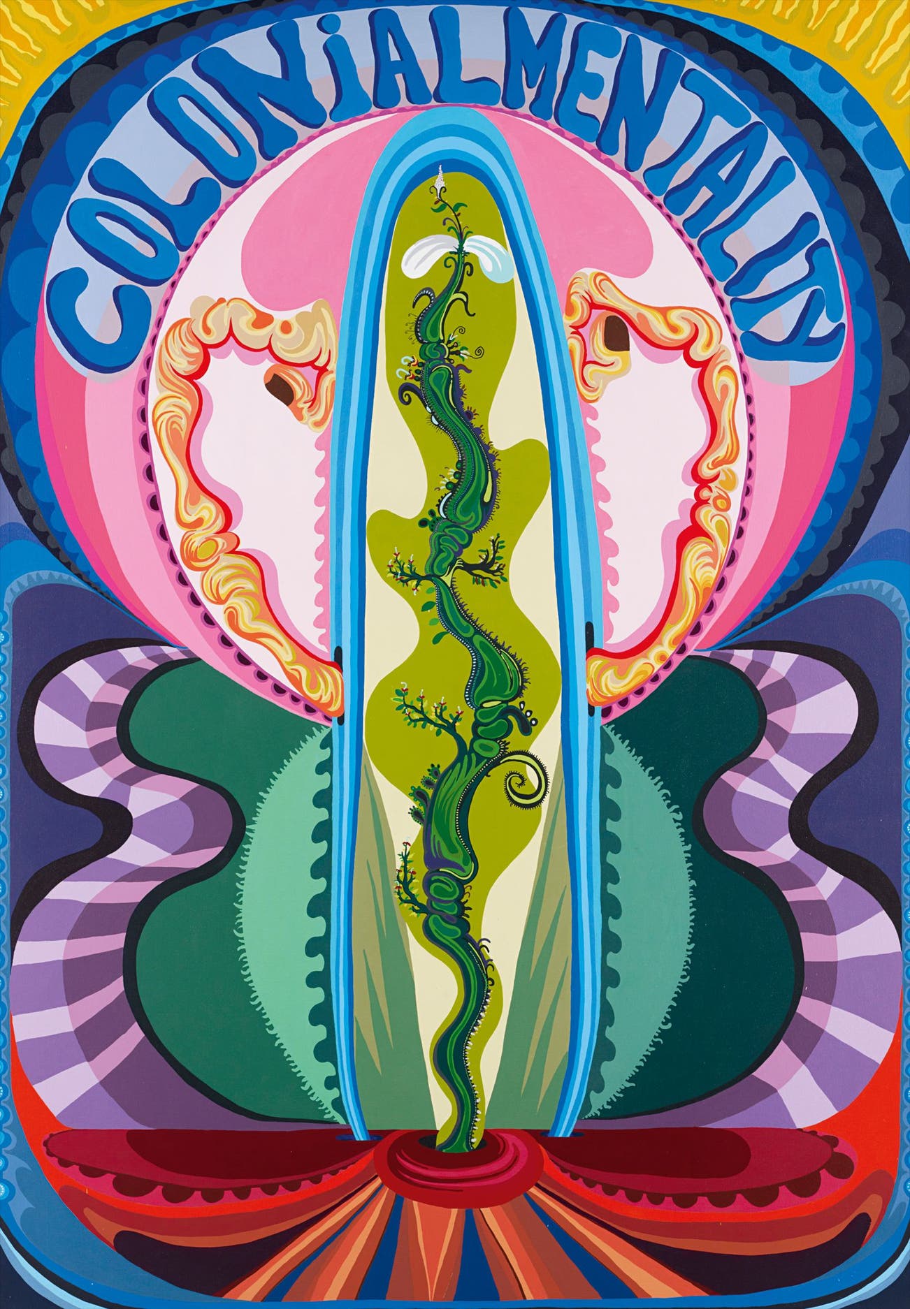 Signed twice, titled and dated twice 'Erik Parker "COLONIAL MENTALITY" 2004' on the overlap.