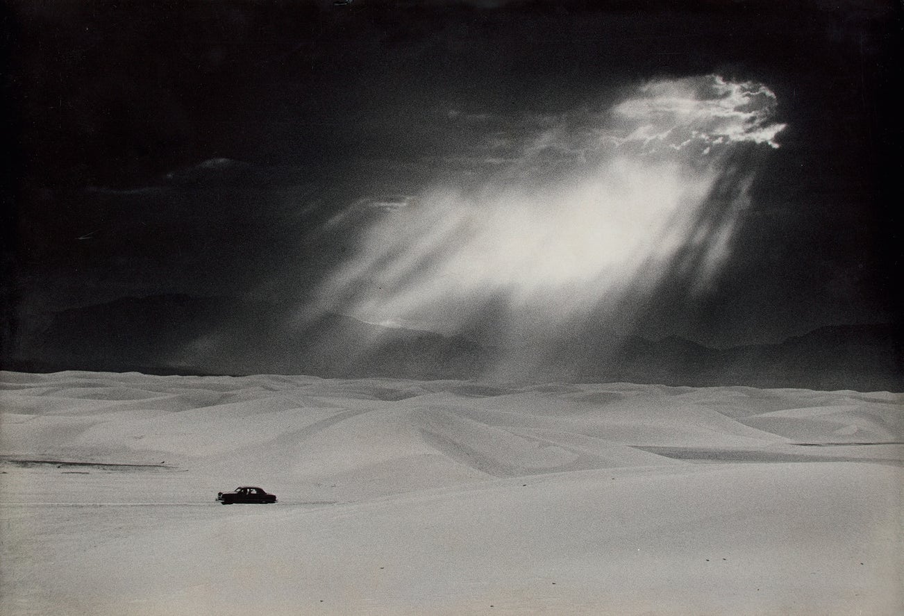 Whether working in color or black-and-white, in the natural world, on movie sets, or on the road, Haas was ever sensitive to the expressive capabilities of light. In this image he has captured the drama of sunlight breaking through the clouds over the dunes of White Sands, New Mexico.