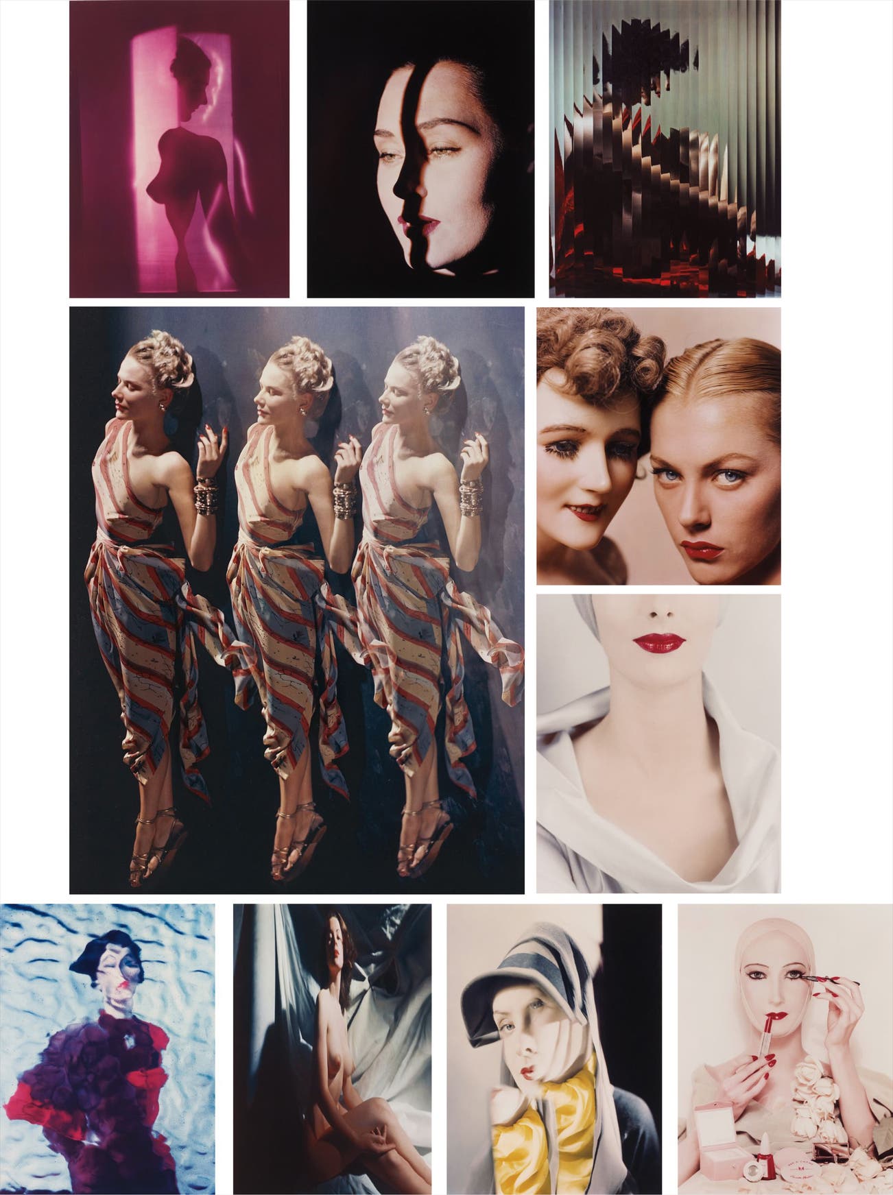Titles in plate order: Decolleté, Cover Study, New York, 1950s; Distorted Nude, New York, 1950s; Model and Mannequin Cover Study, New York, 1945; Broken Mirror, New York, early 1940s; Water Effect Cover Study, New York, early 1950s; Study for an Advertising Photograph, New York, 1948; Line on Face, New York, 1947-1949; Lisette behind fluted Glass, New York, circa 1943; Cubistic Purple Nude, New York, 1949; Three Times Petersen Study for a Fashion Page, New York, late 1940s