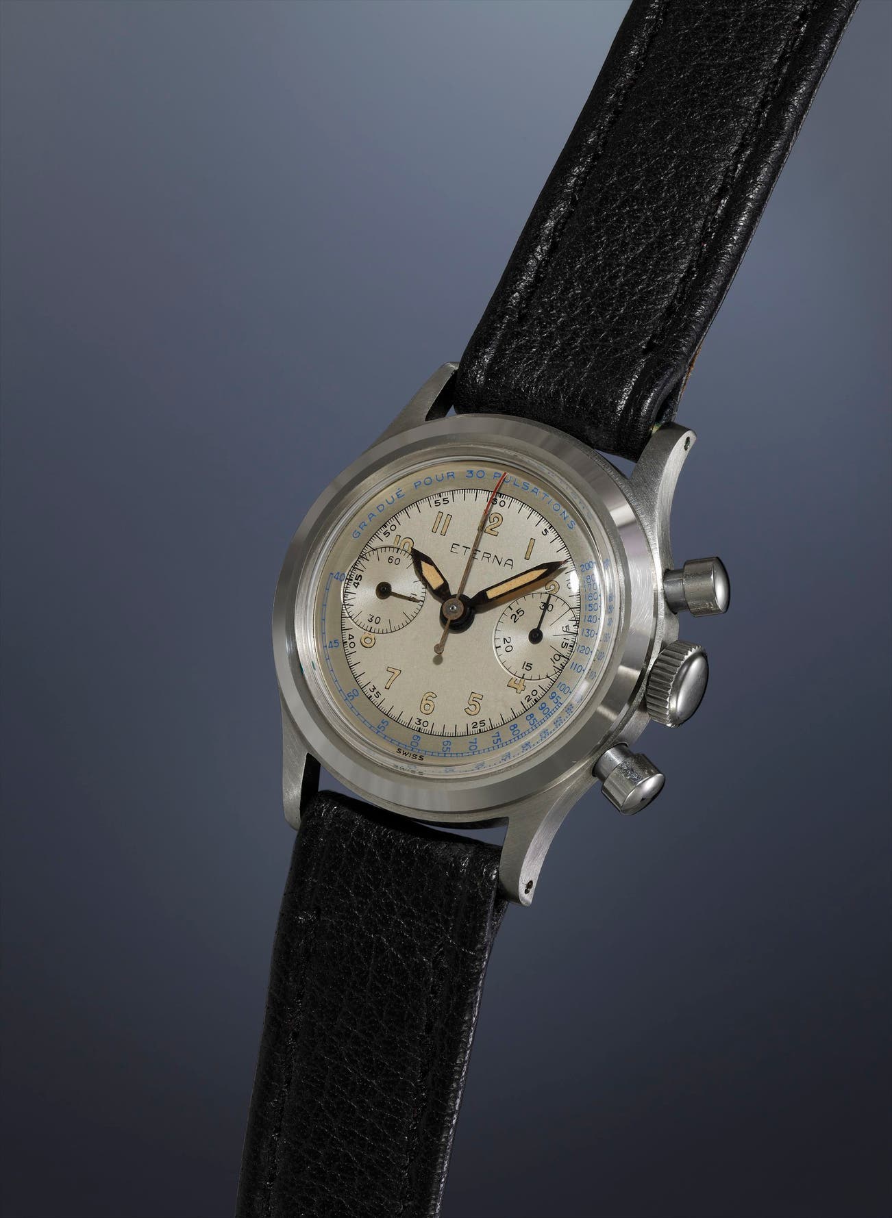 The present lot is, without any exaggeration, ‘New Old Stock’. In an unbelievably mint state of preservation, this watch features the impressive Valjoux caliber 69 – the smallest chronograph movement ever made. Accordingly, it comes as no surprise that the case measures a humble 29.5mm in diameter. Fitted with a stunning silvered dial featuring a blue pulsation scale along the outer rim, one can assume that this watch was intended for medical use. Its small proportions might even suggest that this watch was a testament to society’s progress during the 20th century, and created with a lady’s wrist in mind – perhaps for a nurse.