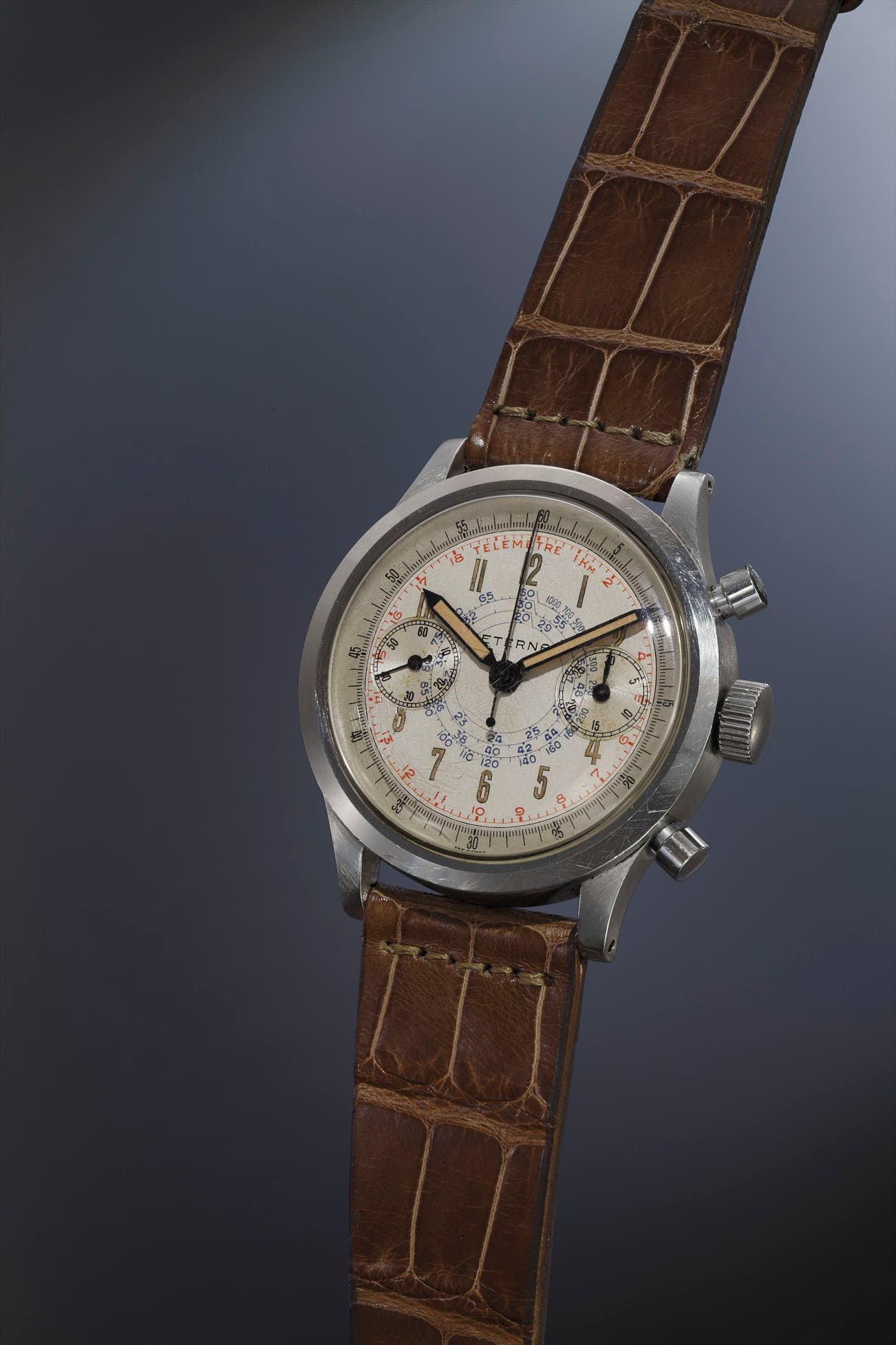 The present watch’s two-piece case is securely fastened by four screws drilled into the underside of each lug, protecting the movement from exposure to humidity and water. Fitted with a stunning silvered dial featuring a concentric blue tachometer scale around the dial’s center, and a red telemeter scale along the outer rim, one can assume that this timepiece was intended for outdoor use, most likely exposing it to inclement weather conditions and rough terrain.