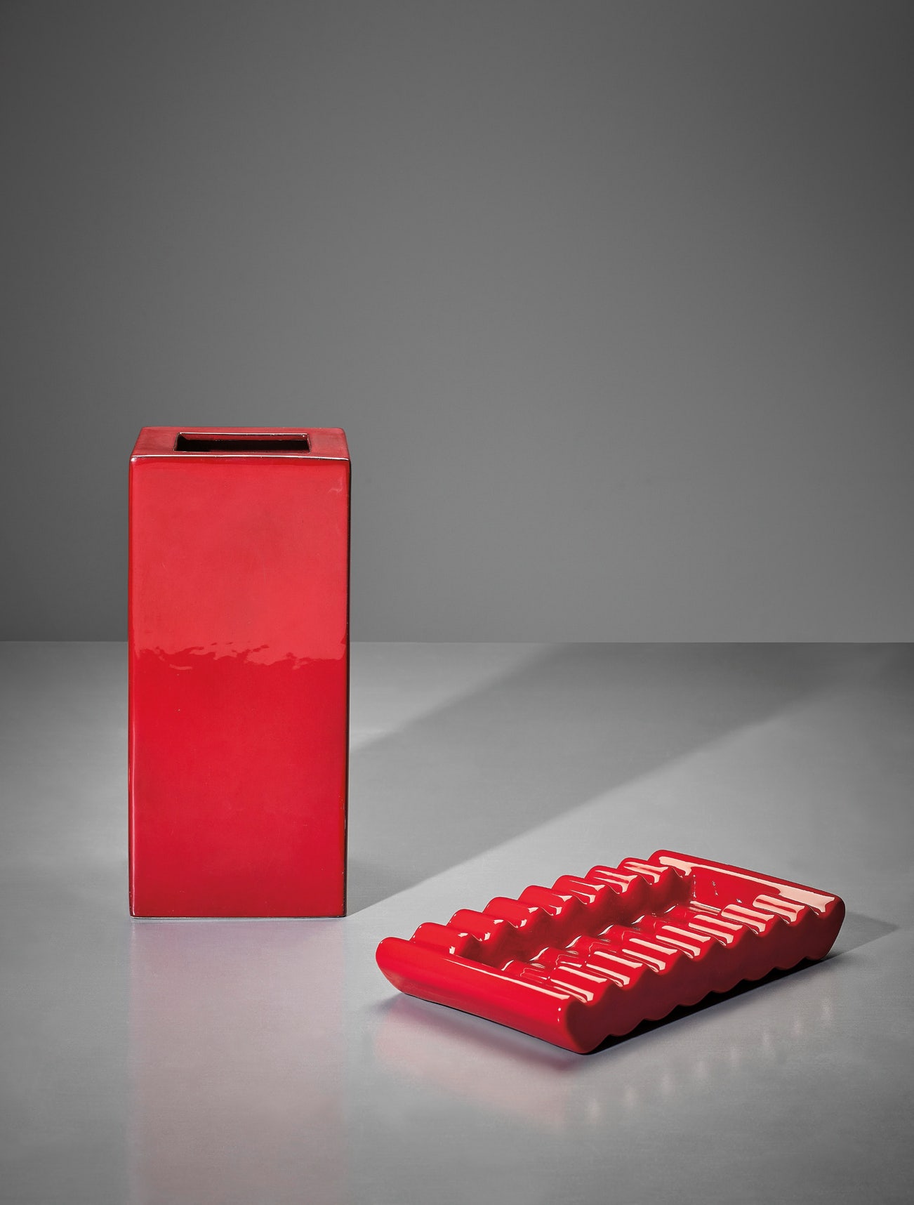 Manufactured by Società Ceramica Toscana, Castelnuovo di Garfagnana for Galleria Il Sestante, Milan, Italy. Underside of each signed SOTTSASS/IL SESTANTE/584 ITALY and SOTTSASS/IL SESTANTE/631/ITALY respectively.