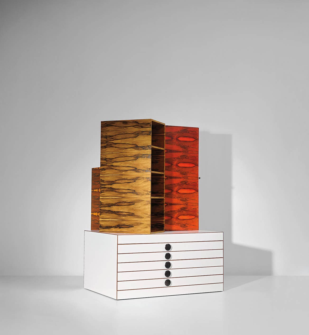 Plastic-laminated wood, stained cocobolo-veneered chipboard, black limba-veneered chipboard, painted wood.