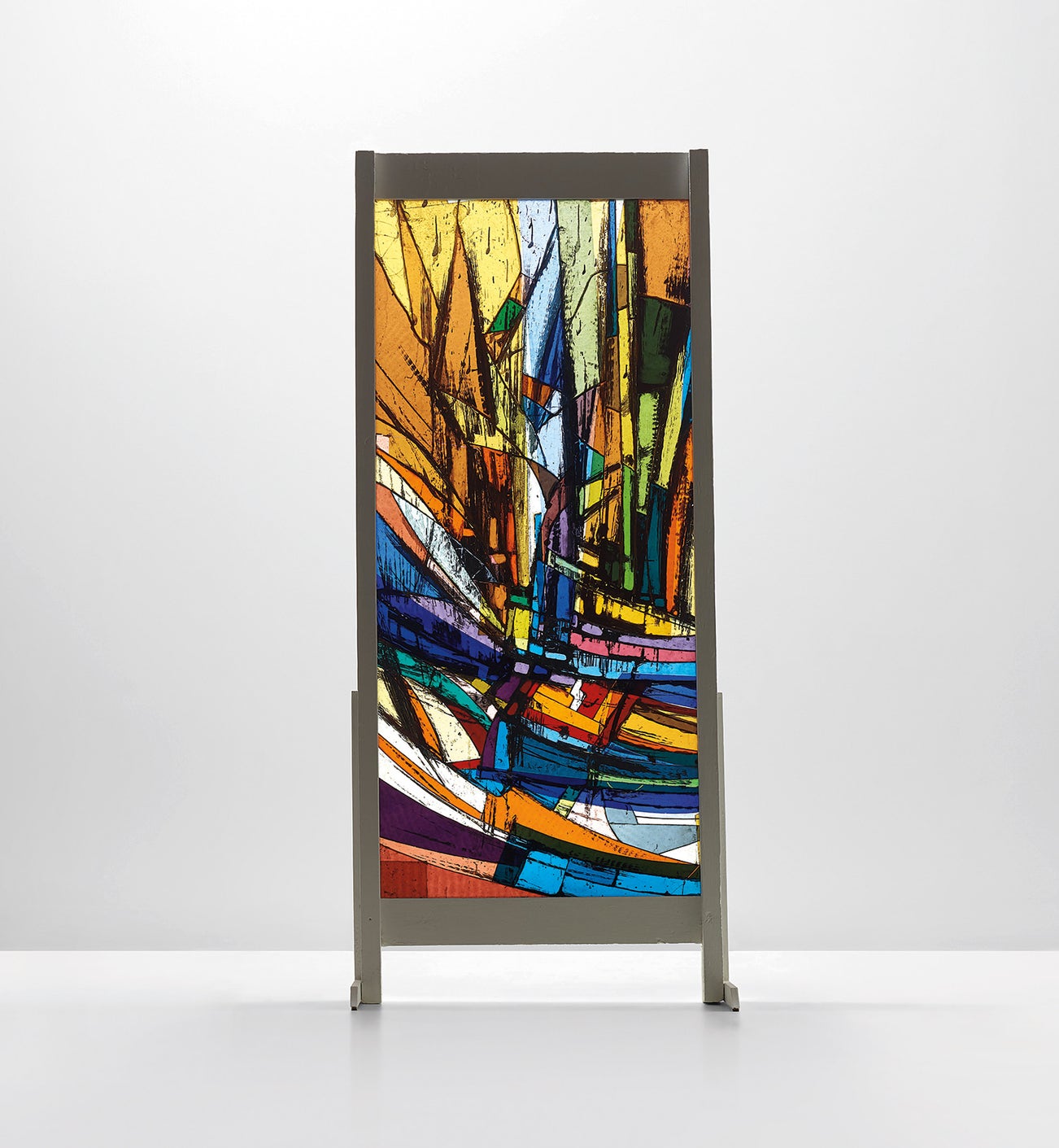 The present glass panel designed by the architect Ettore Sottsass, Jr. was executed in the early 1960s in the Milanese workshop of the Vetrate Artistiche Grassi. Drawing inspiration from the elaborate coloured glass windows of the French cathedral of Chartres, Alessandro Grassi established the workshop in the late-nineteenth century. Under the direction of Alessandro, then later his son Florindo and his grandson Alessandro, the Grassi workshop produced high-quality and refined glass compositions, collaborating with some of the greatest artists and designers of the twentieth century, including Sottsass, Achille and Pier Giacomo Castiglioni, and Arnaldo Pomodoro, among others. During the 1960s, a decade of great artistic innovation in Italy, Sottsass, who experimented across many mediums, expressed the desire to create a stained glass window, both myself and my father Lindo supported his vision to introduce the technique of collage in glassmaking as illustrated by the present work. Based on the architect’s drawings, the piece was manufactured alongside it. Partially painted fired glass pieces were superimposed to glass paste pieces to obtain extraordinary chromatic and perspectival effects. In addition to personally painting the glass, Sottsass designed the collage’s simple wood frame.