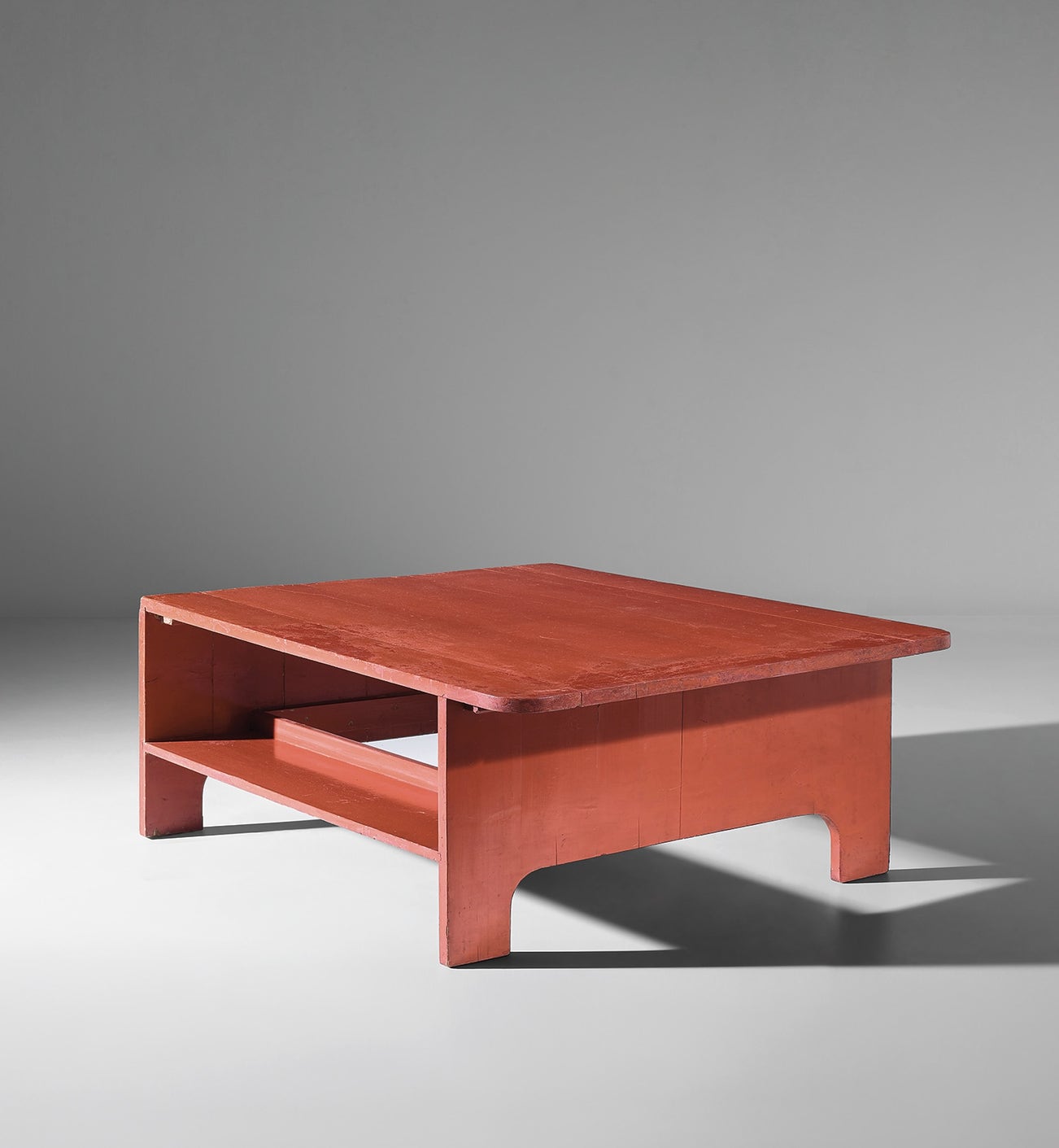 Ettore Sottsass, Jr. designed the present coffee table for the living room of his first apartment in Milan. The architect moved to the apartment in October 1949 following his marriage to Fernanda Pivano, a well-known Italian intellectual and writer. A few years later, the living room was published in an article in Domus, alongside photographs of the interior taken by Sottsass himself, now held in the Bibliothèque Kandinsky, Centre Pompidou, Paris. The photographs illustrate a compact, minimal space, and clarify the integrated, asymmetrical design of the present table. A light wooden structure with fir posts supporting red-painted beams delineates a section of the living room. Within this micro domestic space, the coffee table, painted using the same carmine red, was the central focus. The table’s varied sides related to the surrounding furniture, including a set of yellow-painted plywood chairs oriented toward its integrated bookshelves; a sofa positioned in front of the overhang of the table top; and the opposite side without an overhang facing a wall-mounted bookcase. The small environment was dismantled in 1954, when Sottsass and Pivano moved to a new apartment, for which the architect would design their next interior.