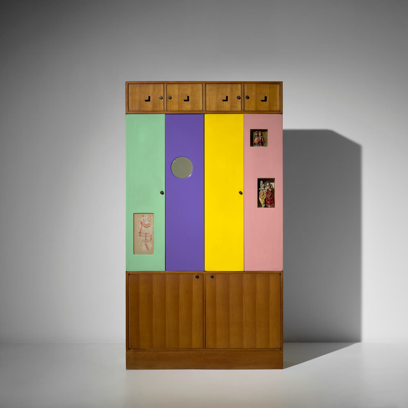 Walnut, painted wood, mirrored glass, glass, brass, stencil painting on paper, beads, fabric, sequins.