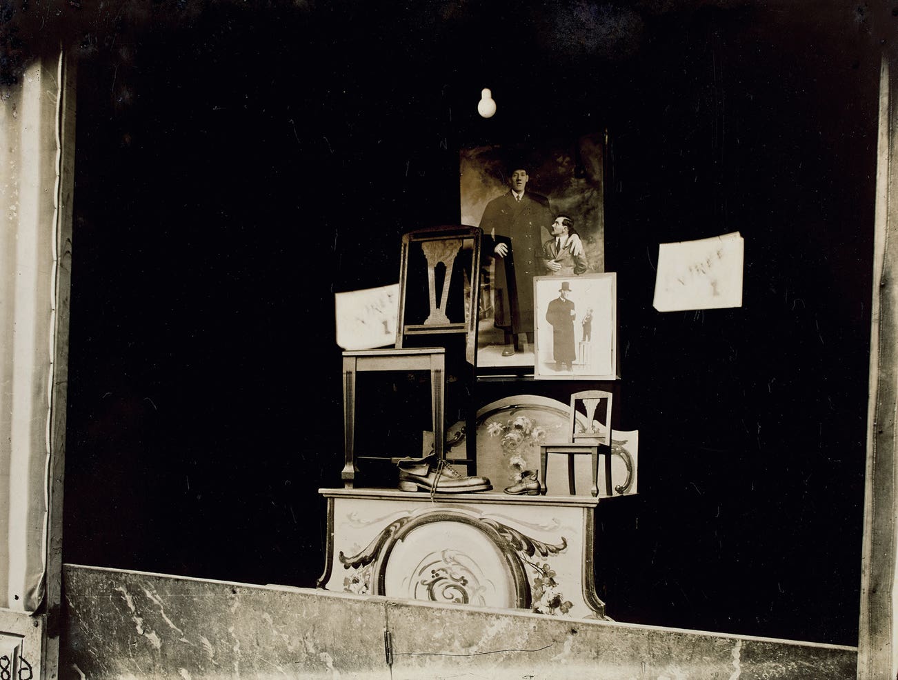 Vailland’s likening of Atget’s work to that of the painter Giorgio di Chirico is of-a-piece with the adoption of the photographer’s work by the Surrealists. Fête du Trône, with its mysterious juxtaposition of discordantly-sized items – two photographs of Armand the Giant, one in which he poses with the smallest man in the world, alongside large and miniature chairs and shoes – encapsulates Atget’s appeal to the Surrealists, who found in his work evidence of the ineffable strangeness of daily life. In 1926, through Man Ray, Atget’s neighbor and friend, Atget’s photographs were published in La Révolution Surréaliste, the movement’s leading journal. It is one of the ironies of photographic history that Atget, whose work was firmly rooted in the succinct documentation of the visible world, would be embraced and promoted by the dream-obsessed Surrealists.
