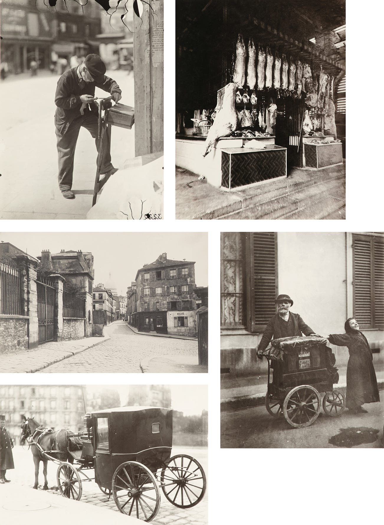 Titles include; Joueur d’orgue, circa 1898-1899; Rue Norvins, 1922; Reparateur de Scies, Sawblade Sharpener, 1899-1900; Le Fiacre Avant Les Pneus, 1898; Untitled (Meat Display), n.d.
