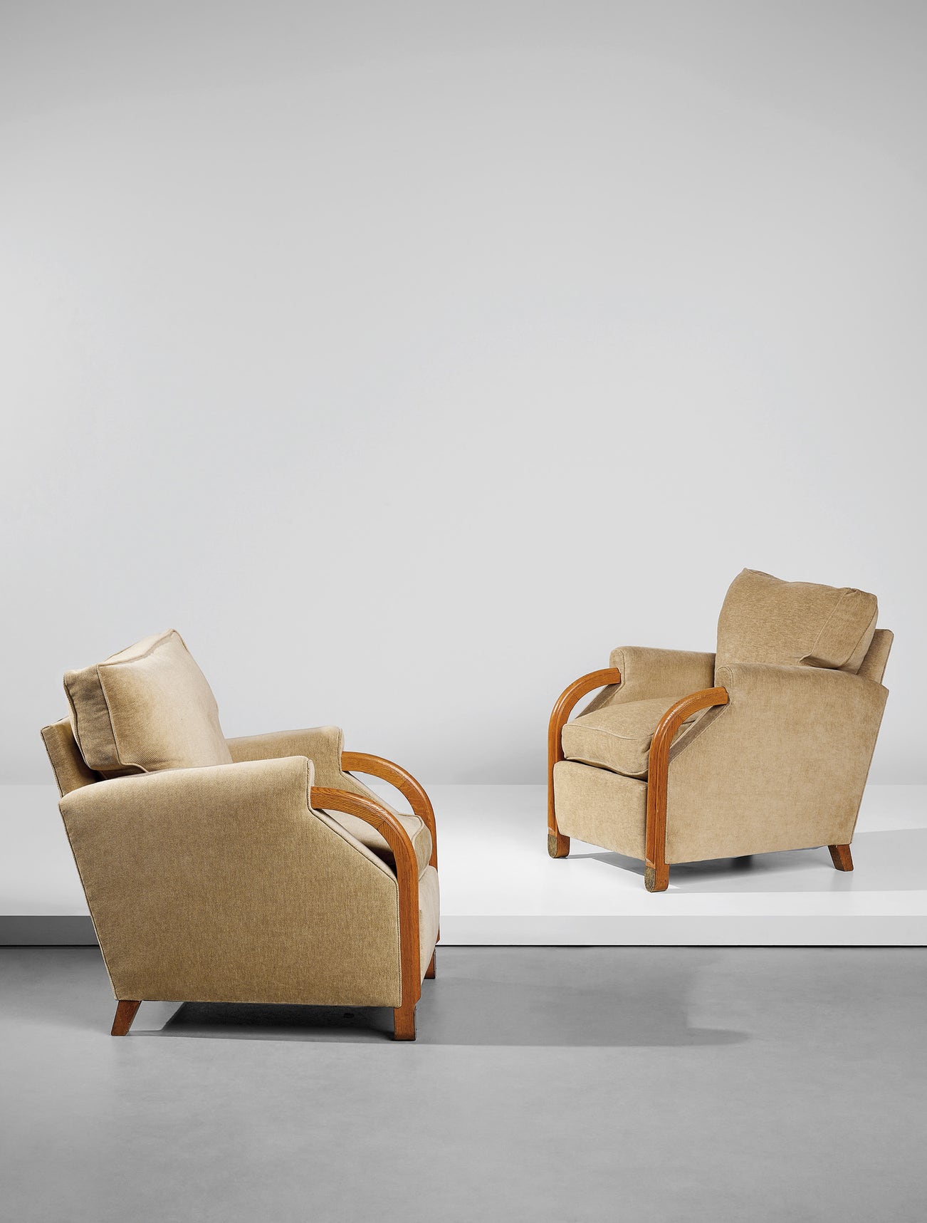 Eugène Printz exhibited the present model armchair in 1934 and 1935 as part of an office set at the Salon des Artistes Décorateurs. The armchairs feature curved armrests with bas-relief carving, extending into the front legs and terminating with a brass detail. The design exemplifies Printz’s desire to reconcile Art Deco refinement with the modernist ideal to design furniture in line with contemporary living.