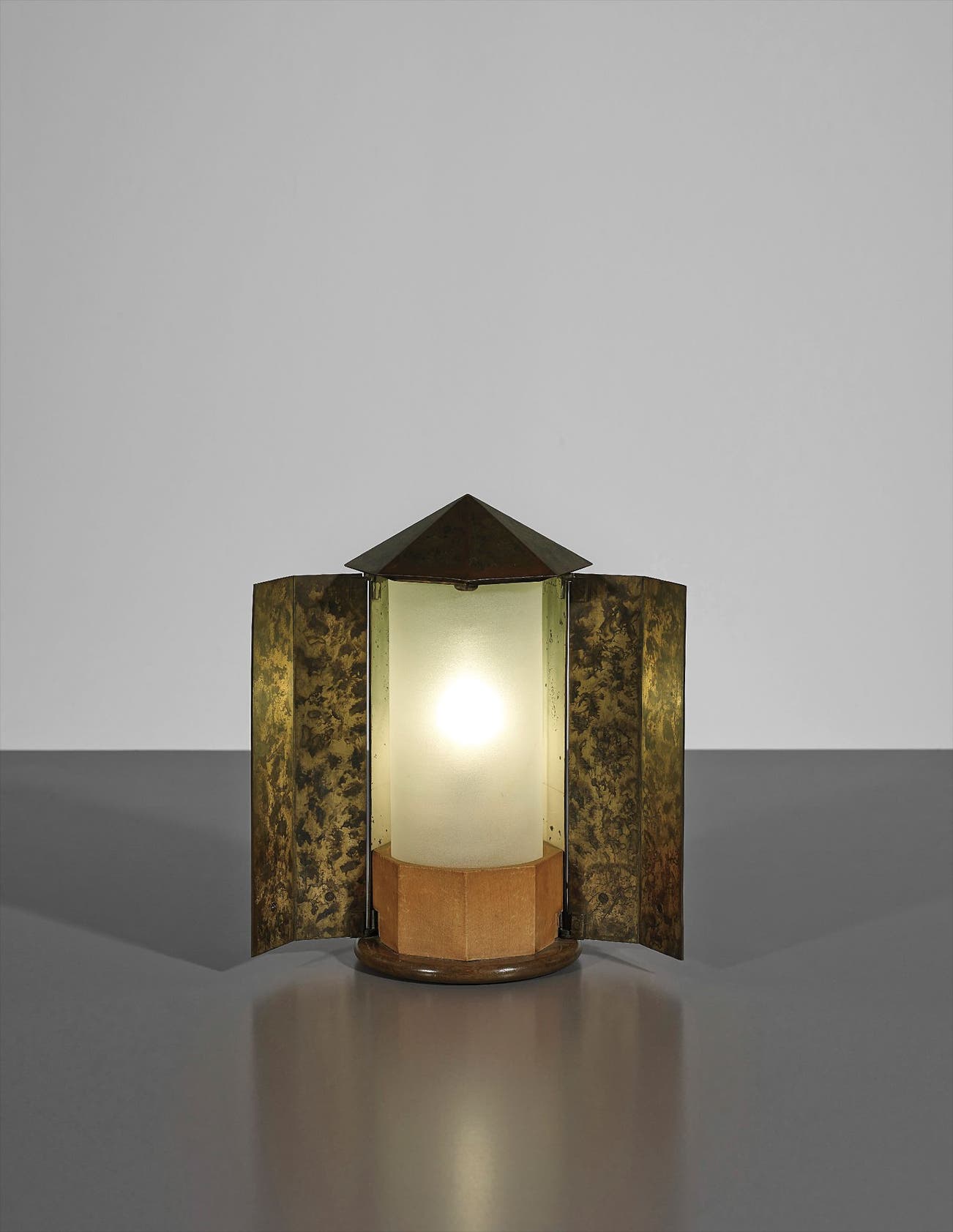 Patinated brass, painted brass, sycamore, walnut, opaque glass.