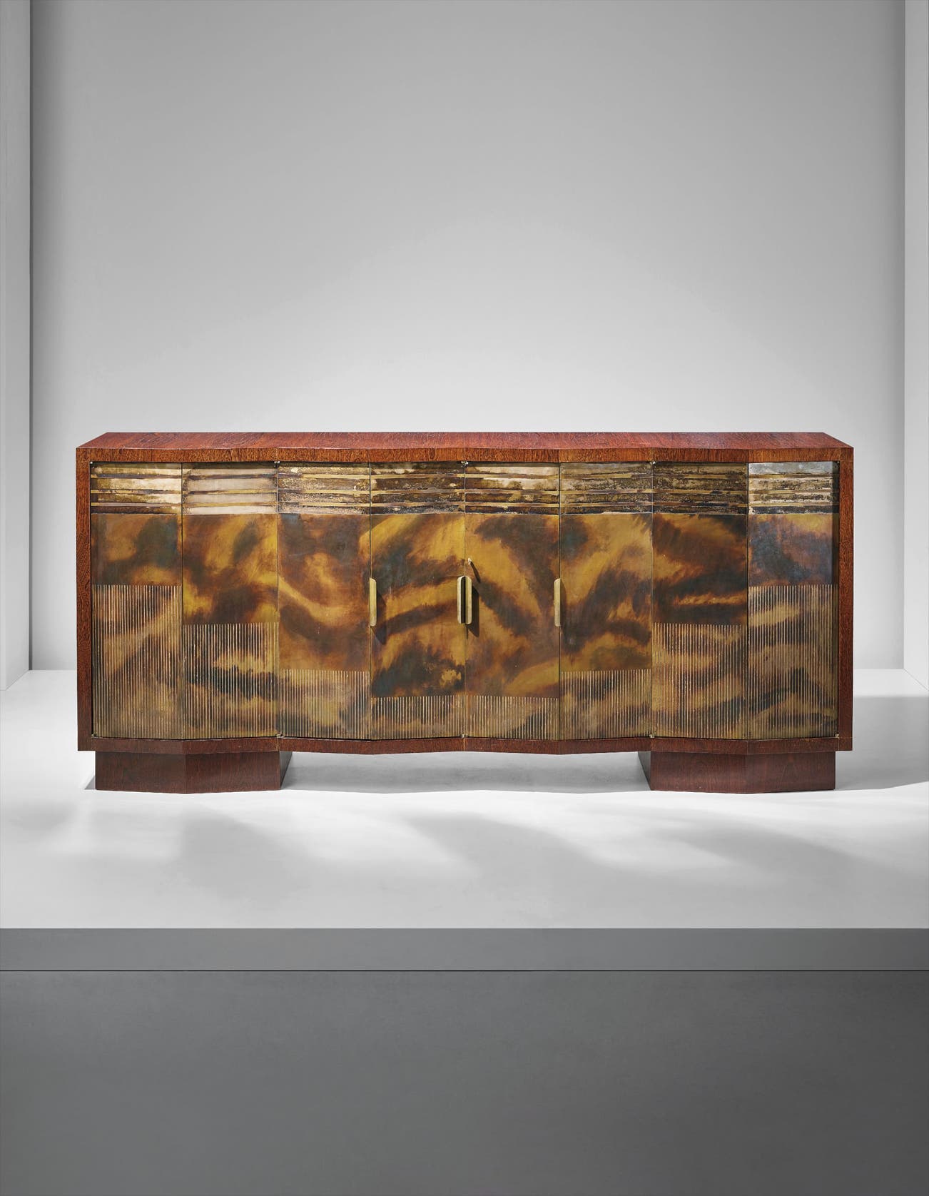 The present lot exhibits the mastery and singularity Eugène Printz and Jean Dunand attained by combining traditional craftsmanship with a modern aesthetic. Printz, trained in cabinetmaking techniques from the ancien régime, approached his furniture as works of art through which he pushed technical and stylistic boundaries. Similarly, Dunand utilized traditional lacquering and metalsmithing methods to develop innovative surface effects. The moment that this sideboard was created represents the inception of Printz’s mature style and also marks the beginning of a long collaboration between the two master craftsmen. The synergy between Printz and Dunand resulted in a progressive iteration of Art Deco that anticipated modern furniture of the following decades.