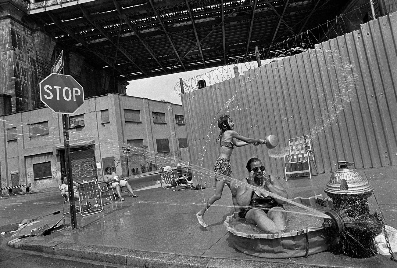 On a very hot day in Dumbo, New York City, Eugene Richards walked past a grandmother and some children on his way to the subway. While the grandmother sat in a wading pool, a little girl was playing, throwing buckets of water in the air. This image was featured in Richards' book American We, published by Aperture in 1994. The book explored the many faces of America - from the tender, to the funny, the disturbing to the sublime. Americans We was the recipient of the International Center of Photography's Infinity Award for Best Photographic Book in 1995.