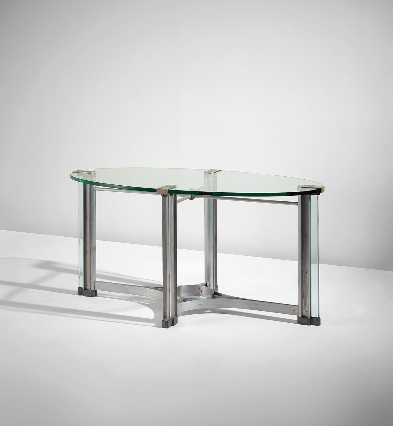 The table design brings together several points of influence to striking effect. The more classically inspired strand of French Art Deco is demonstrated by its oval form and lower decorative stretcher. The exposed construction of the visible screws introduces a machine age vocabulary. In her thesis “Eugene Schoen: Designs for Furniture 1927-1936,” Karen Rigdon points out that the table displays aeronautic motifs in the glass wing-like form of the legs and the circular stretcher, which she likens to the nose cone of an airplane. Rigdon describes this feature as representative of a turning point in the aesthetics of Schoen’s work: “from the late 1920s to the mid-1930s Schoen’s designs turned from a vertical orientation, characterized by the city sky line, to the impersonal sleek contours associated with high speed vehicles.” And yet for all these characteristics familiar to the period, the table was neither limited by dogmatic principles of international style modernism, nor was it born of an avante-garde movement. It was designed by a proponent of a distinctly American approach to modernism who was able to amalgamate various inspirations, and who had the latest manufacturing technologies and materials at his disposal.