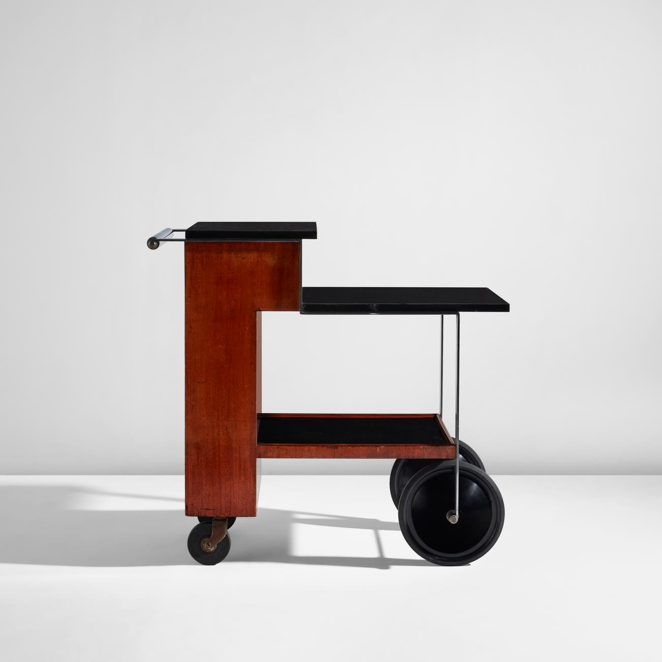 Walnut, steel, chromium-plated brass, Bakelite-covered wood, painted steel, rubber.