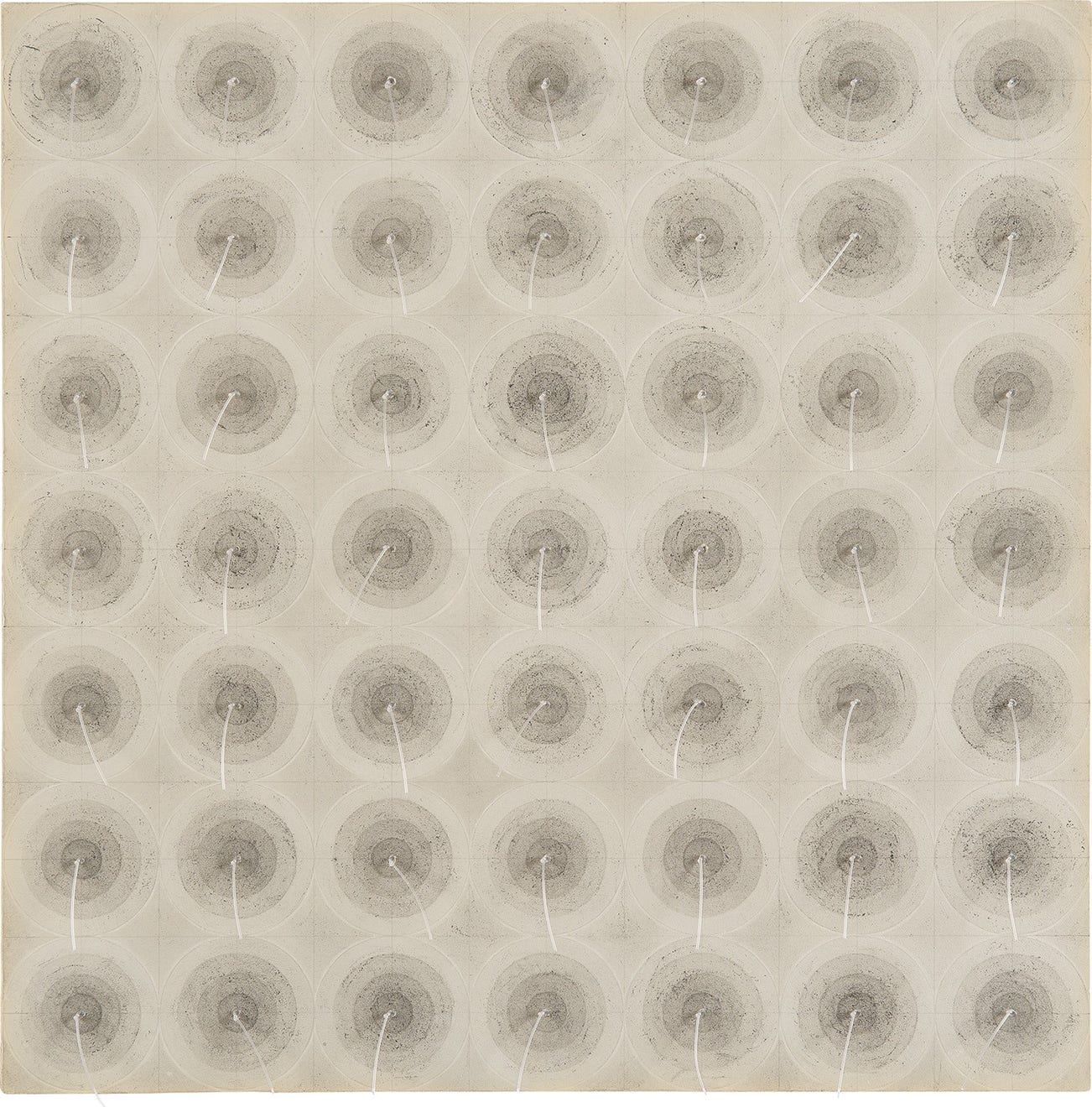 Executed in 1967, No title showcases Eva Hesse’s resistance to any one art historical categorization. A key member of the art world in 1960s New York, Hesse occupied a unique position in a circle of post-minimalist artists, including Sol LeWitt, Robert Mangold, Robert Ryman and others. The present work, rendered in subtle, gray graphite and ink washes features a grid of 49 circle motifs from which narrow, malleable pieces of nylon string protrude from their centers. Paralleling the artist’s refusal to be reduced to one particular movement, the work itself challenges classification as a single medium, straddling the disciplines of drawing and sculpture and appearing as a wall-bound object. Originally dedicated to the artist’s dealer and friend Donald Droll and fellow artist Roy Leaf, the work was exhibited for the first time in Hesse’s seminal 1972 show held at The Solomon R. Guggenheim Museum, New York just two years after her death, one that would solidify her place in the discourse of post-war and contemporary art.