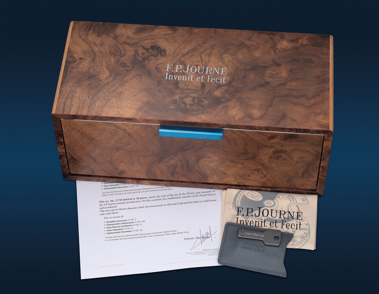This exceptionally rare wooden presentation box - produced in a limited edition of just 38 examples to accompany F.P. Journe's initial 38mm stainless steel series - represents one of the finest distillations of luxury horological craftsmanship. Combining its retained forms, warm wooden tones and luscious grey interior, the overall design creates an ideal home for the five exceptional watches that are highlighted along this lot. The contents clearly indicate the care invested in conceiving this luxurious set, with the inclusion of a bespoke polishing cloth, additional pair of gloves and the original certificate, which attest to F.P. Journe's obsession with perfection in every detail - extending even to the presentation of his watches. In this sense, the accompanying wooden box transcends its utilitarian function, assuming an almost metaphysical significance. It provides an entry point into F.P. Journe's singular creative universe, inviting us to marvel at his rare synthesis of "invention and manufacture" in forms that endure through excellence of conception.