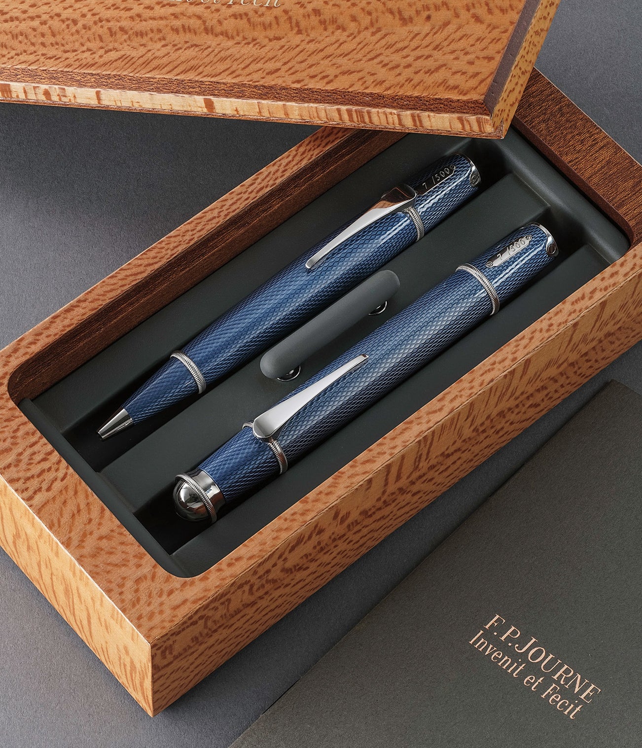 It seems F.P. Journe can do no wrong. Whatever the genius watchmaker sets his mind to, he achieves with gusto. When he decided, in 2008, to design a set of writing instrument F.P. Journe did it with the passion that characterizes his watches. The result was a limited edition set composed of a fountain pen and a ballpoint pen, each one hand finished, signed and numbered. The set was available in either platinum and titanium or pink gold and titanium, Journe’s favorite metals.