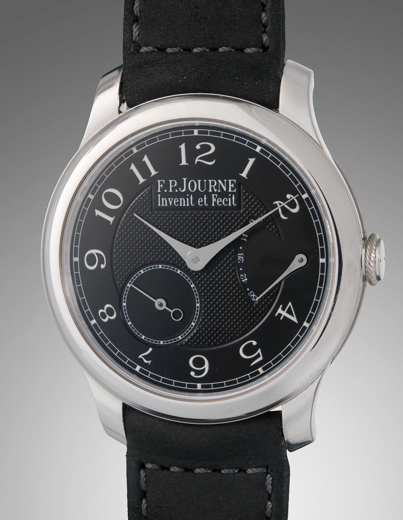 The present, elite “Black Label” model with platinum case was only offered to existing owners of F.P. Journe watches, and only available to purchase through an F.P. Journe Boutique. With its beautiful and minimalist black guilloché dial with white Arabic numerals, it is easily readable, and its 40mm diameter case is well-proportioned and balanced, comfortably fitting wrists of all sizes. The highly accurate caliber 1304 is a marvel to look at, and is made from solid 18 karat pink gold, featuring two mainspring barrels allowing for a 56-hour power reserve. Contemporary, elegant yet classic, this timepiece is the perfect match between the genius of its creator and the elegance of a timeless design.