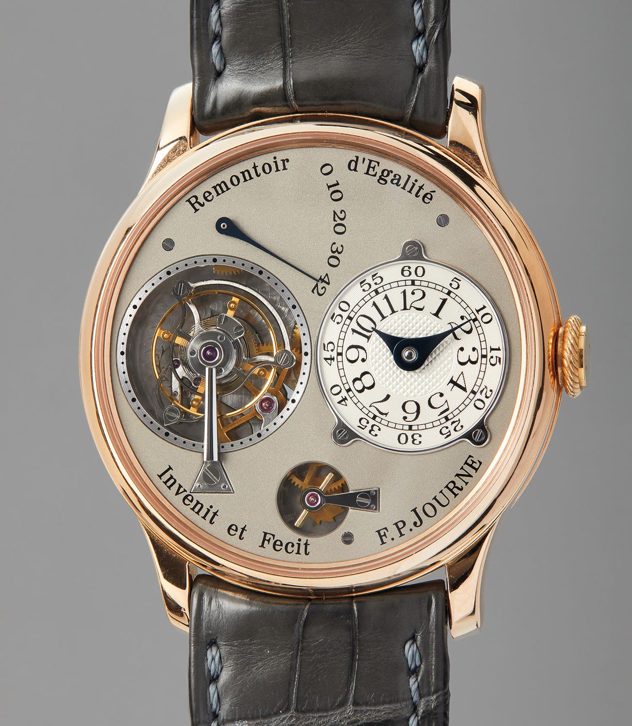 The grey dial itself is a luxury to behold under the lens of a loupe, as the subtle powdery texture gives it a shimmering metallic sheen much like newly fallen snow. The warmth of the pink gold case makes a striking combination with the coolness of the dove grey dial. Fresh-to-the-market and offered in exceptional condition from the collection of a prominent collector, this eminently rare timepiece is sure to excite Journe collectors the world over.