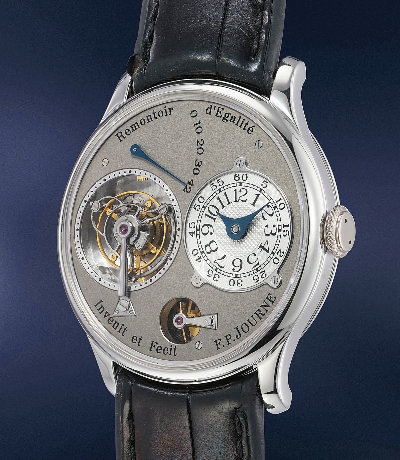 An extremely rare, beautiful and important platinum tourbillon wristwatch with remontoir d’egalité, brass movement and white gold dial