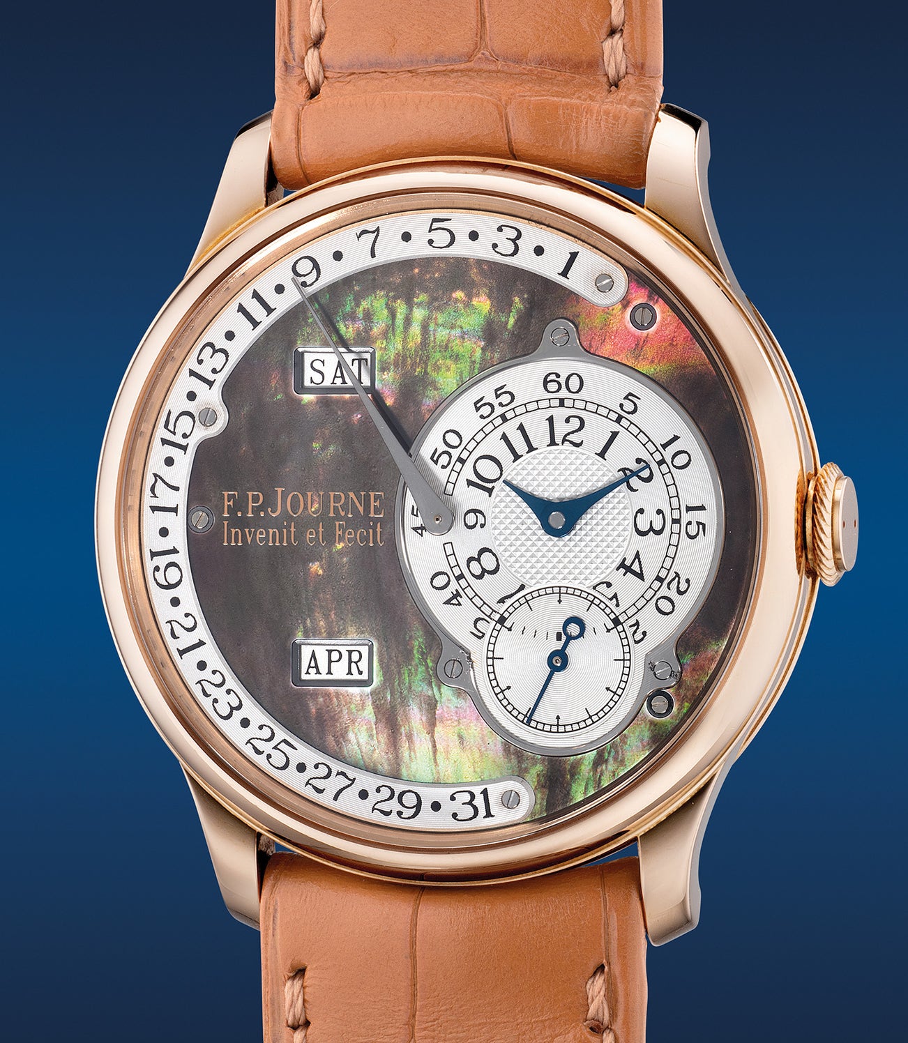 The present example F.P. Journe Octa Calendrier in pink gold from circa 2006 with a 38mm diameter case belongs to an extremely rare variant featuring a black mother-of-pearl dial launched as a limited edition of 10 pieces in 2005 for Singaporean retailer Sincere Fine Watches. Launched together was 10 examples of Tourbillon Souverain and 10 examples of the Resonance all cased in pink gold with a black mother-of-pearl dial. The present example is the second to be offered at a PHILLIPS auction and is complete with its full set of accessories and was just recently overhauled by F.P. Journe with no signs of polishing.